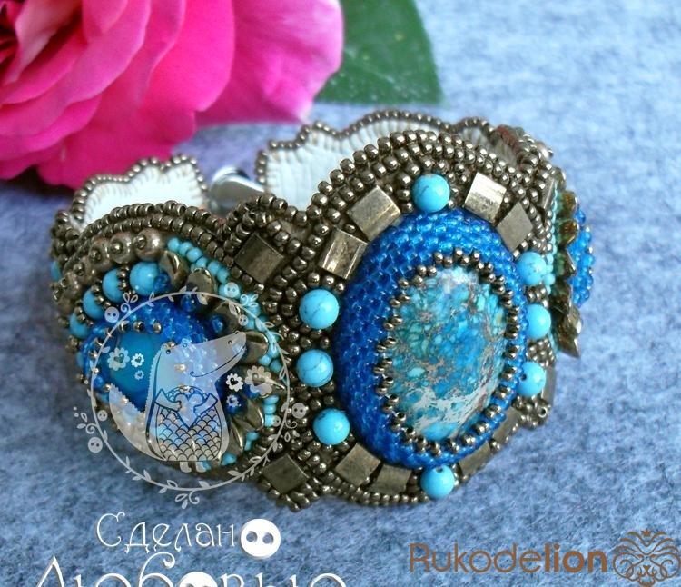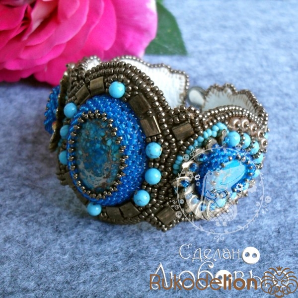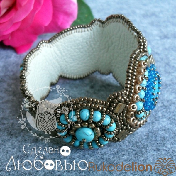 Браслет "Восточная сказка" с синим варисцитом и японским бисером. Обратная сторона кожа.