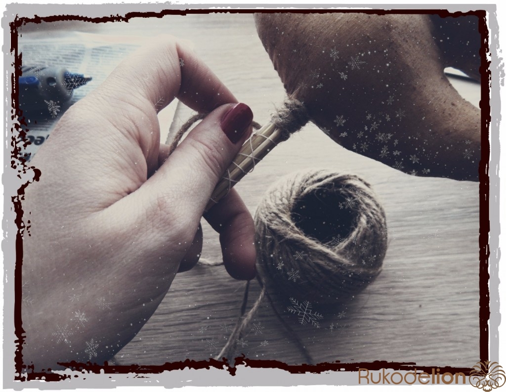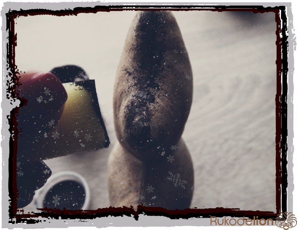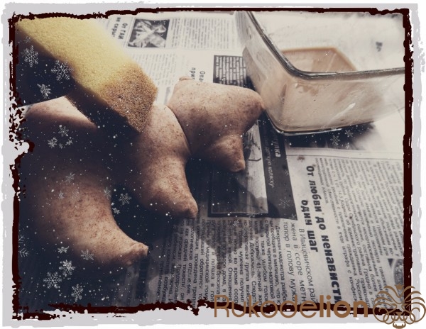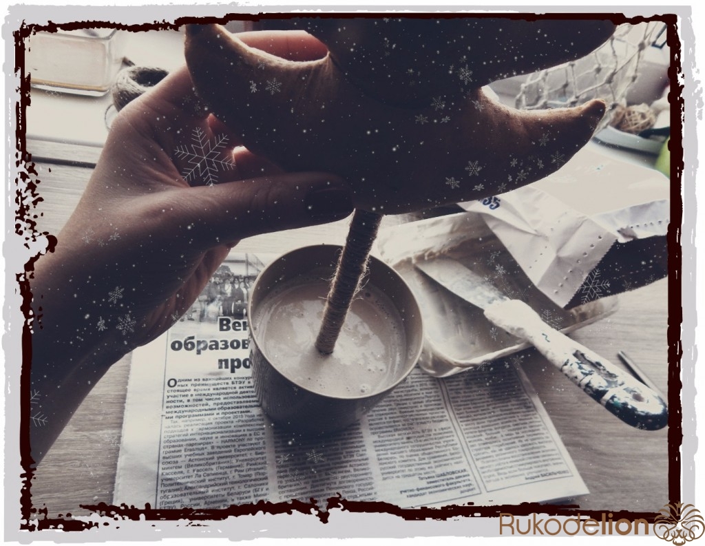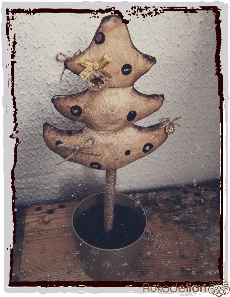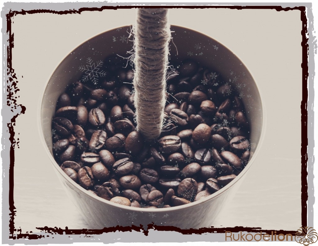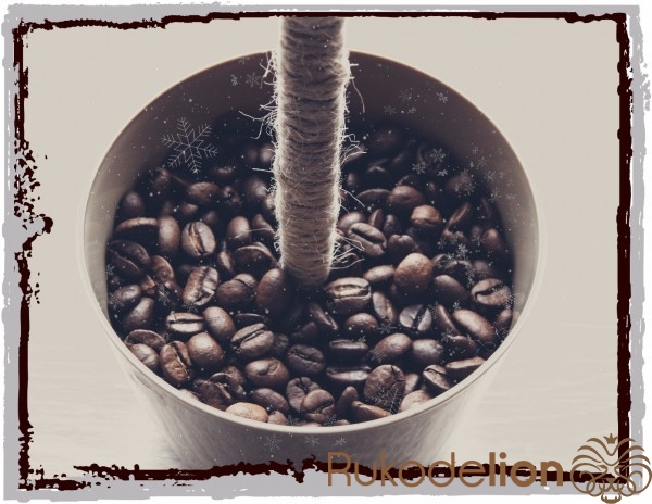 Далее готовим кофейный раствор. Для этого нам понадобится 150 г. горячей воды, 1,5 ч.л. нерастворимого кофе, 0,5 ч.л. корицы, 1 ч.л. ванилина, 1 сл.л. клея ПВА. Завариваем кофе, добавляем корицу, ванилин, ждем пока остынет и добавляем клей ПВА. Смачиваем в растворе губку и пропитываем им нашу елочку. Оставляем ее до полного высыхания. Можно процесс высыхания ускорить при помощи фена.
