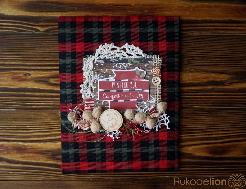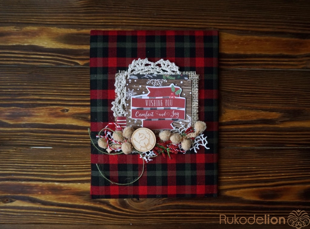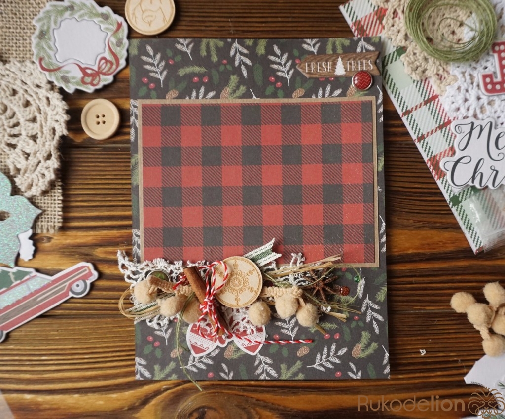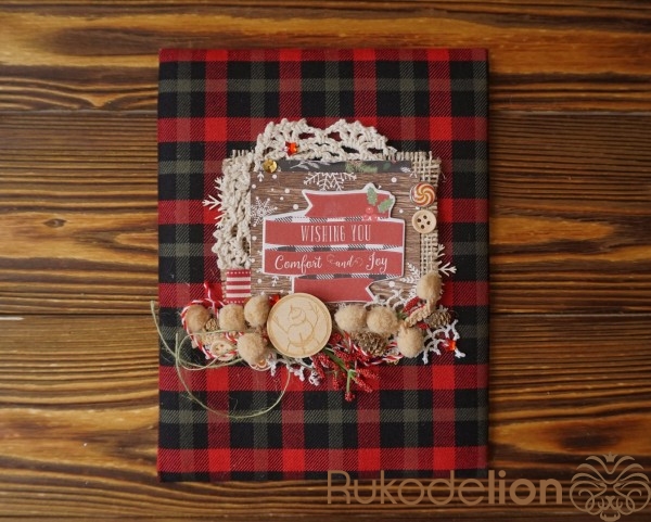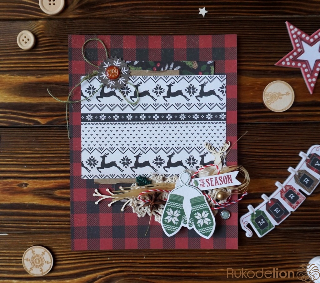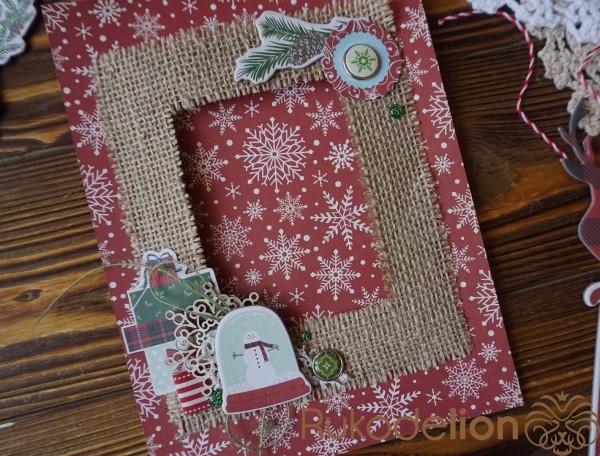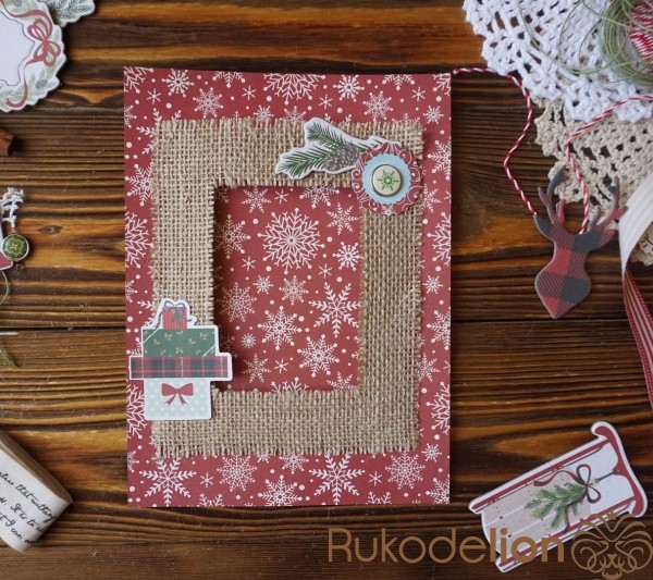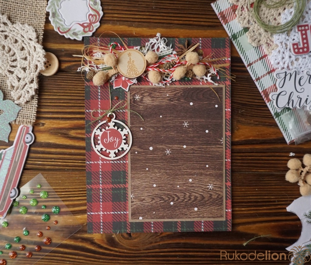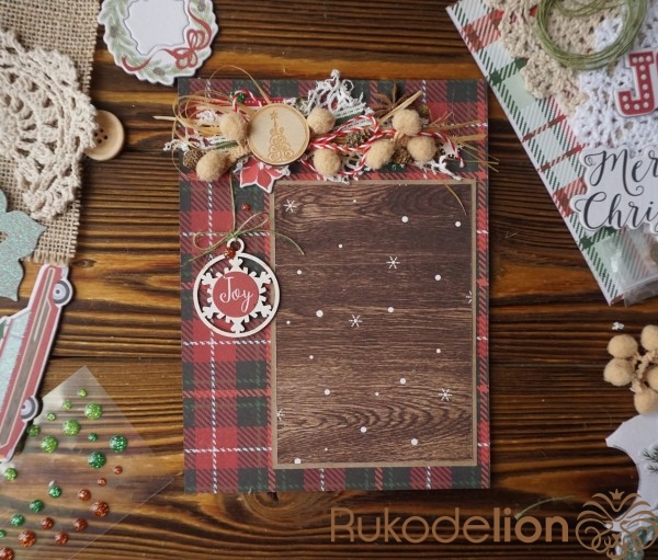 В работе использовала красивую коллекцию "Comfort and Joy" от MME (набор бумаги и чипборд), мешковину, рафию, маленькие шишечки, деревянные фишки и чипборд, брадсы и мелкий декор вроде пайеток.