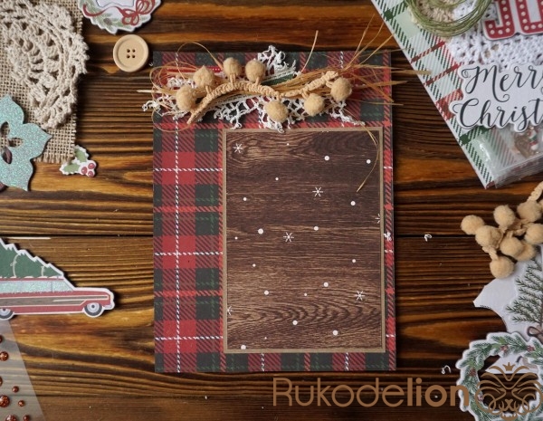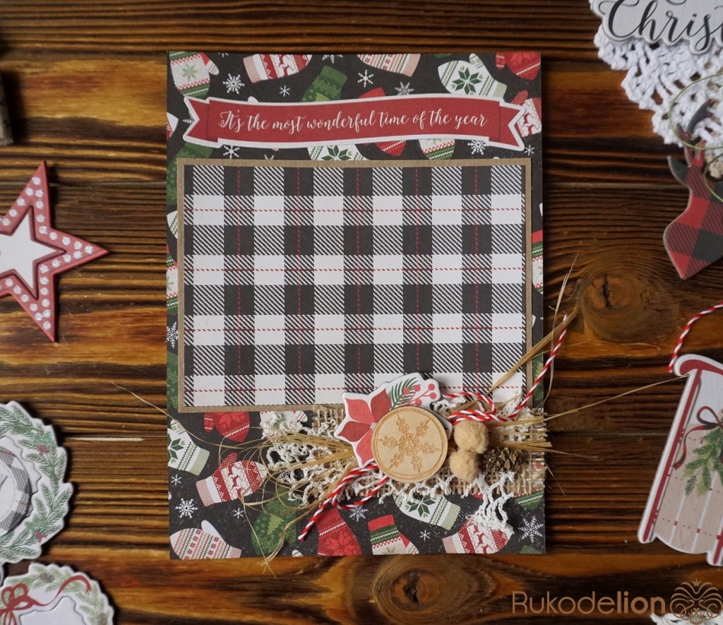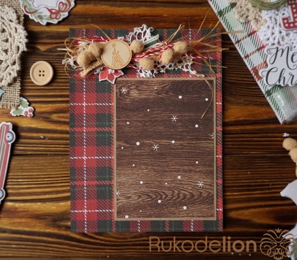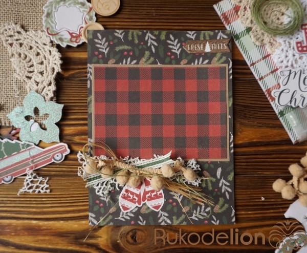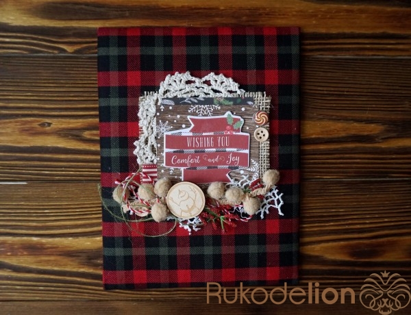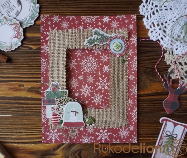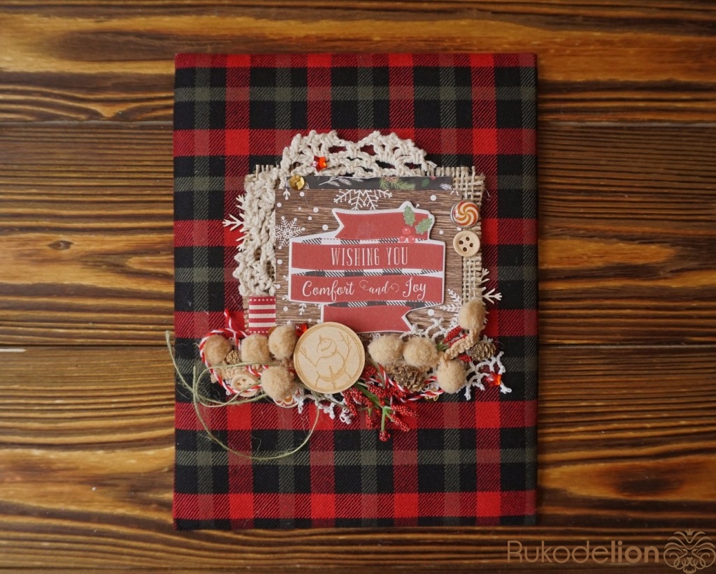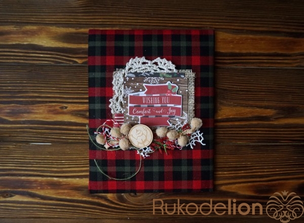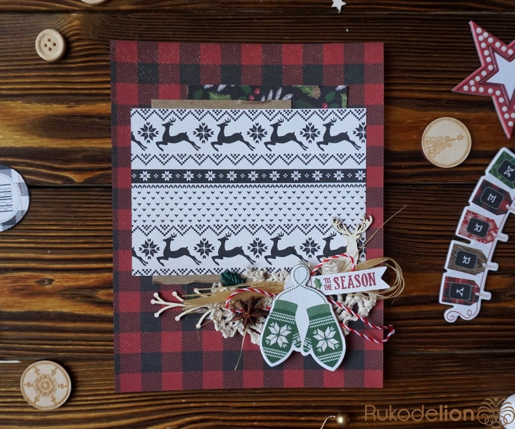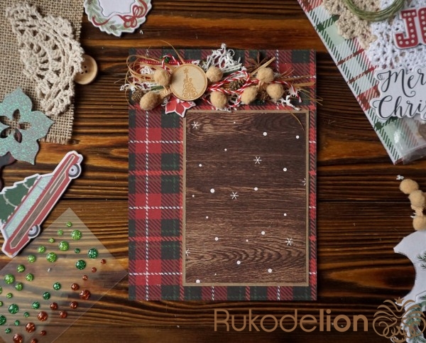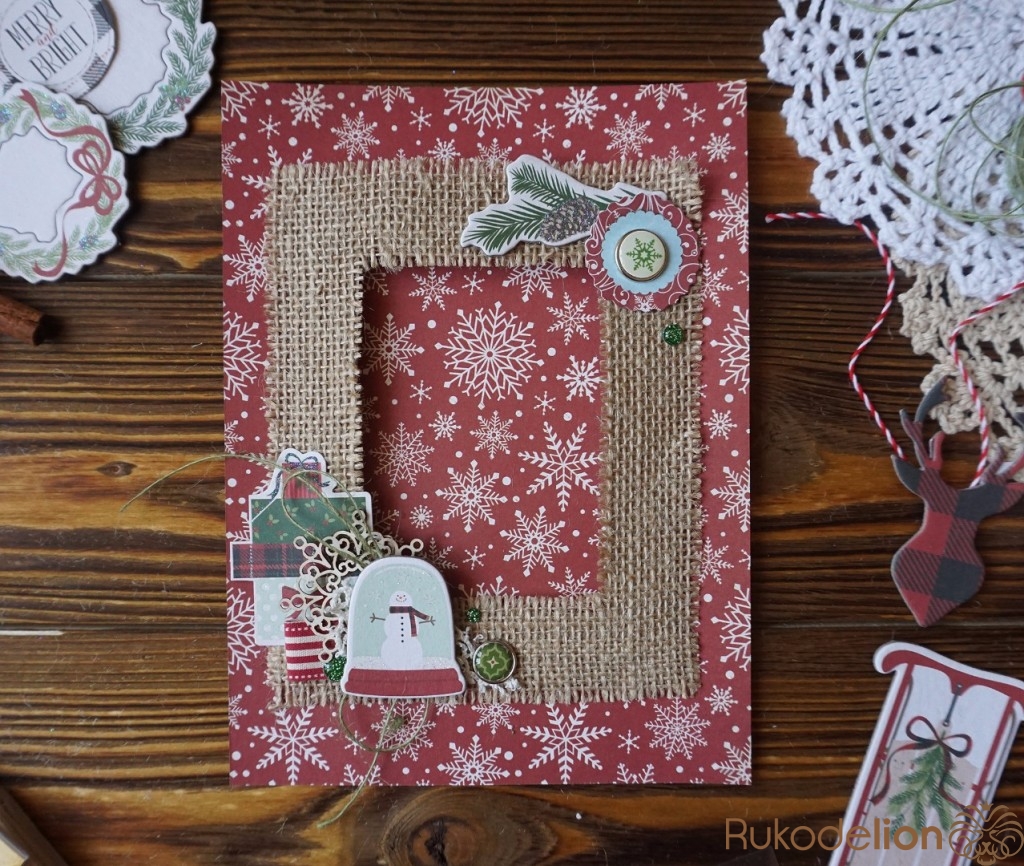 В работе использовала красивую коллекцию "Comfort and Joy" от MME (набор бумаги и чипборд), мешковину, рафию, маленькие шишечки, деревянные фишки и чипборд, брадсы и мелкий декор вроде пайеток.