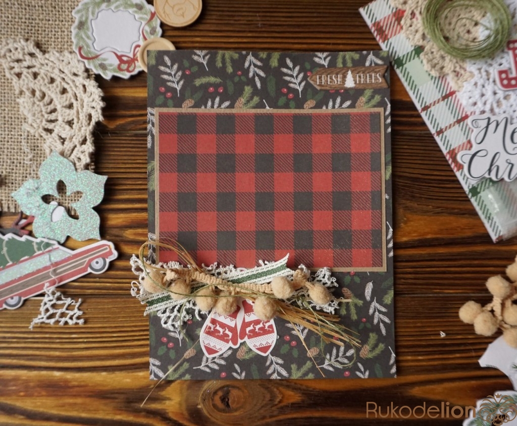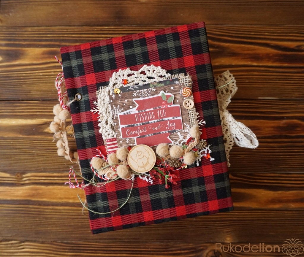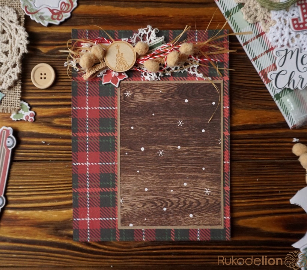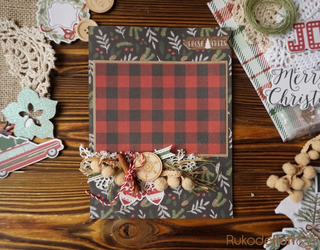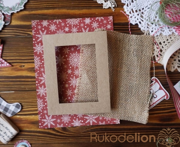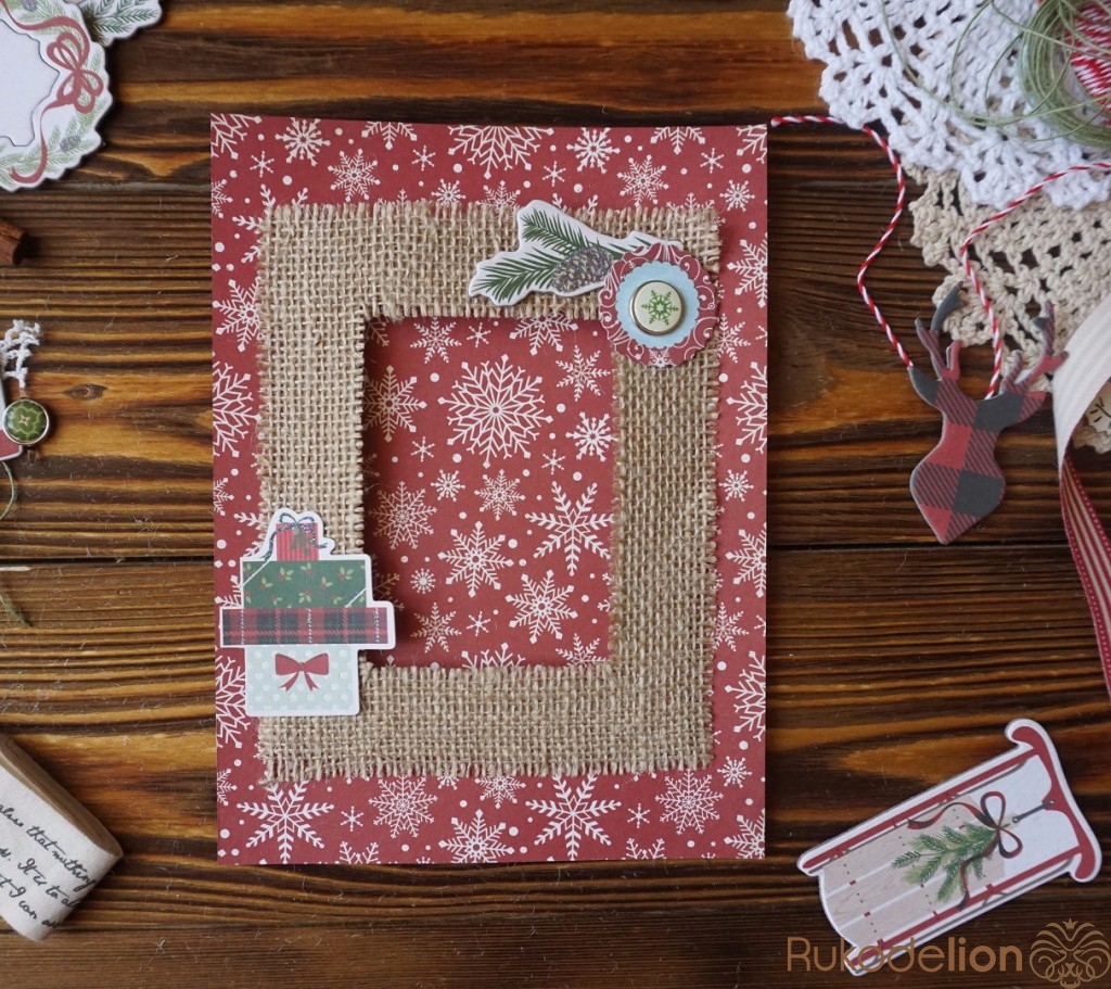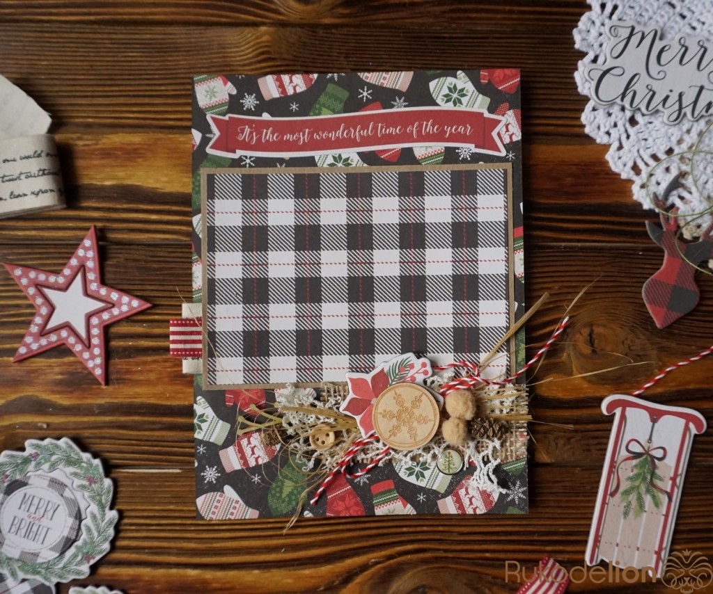 В работе использовала красивую коллекцию "Comfort and Joy" от MME (набор бумаги и чипборд), мешковину, рафию, маленькие шишечки, деревянные фишки и чипборд, брадсы и мелкий декор вроде пайеток.