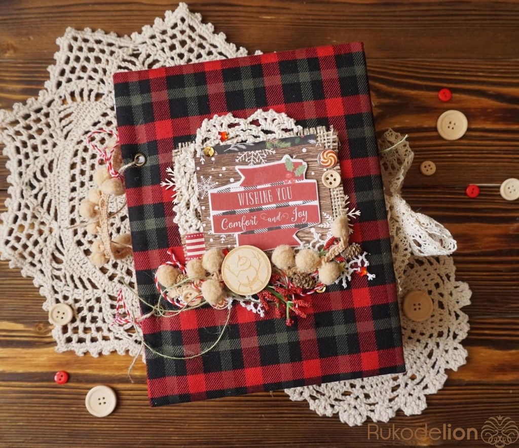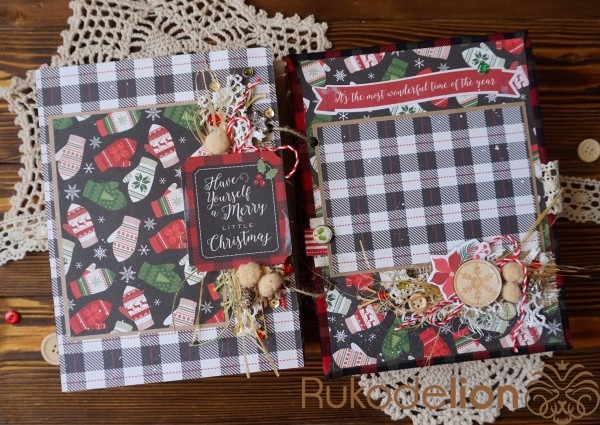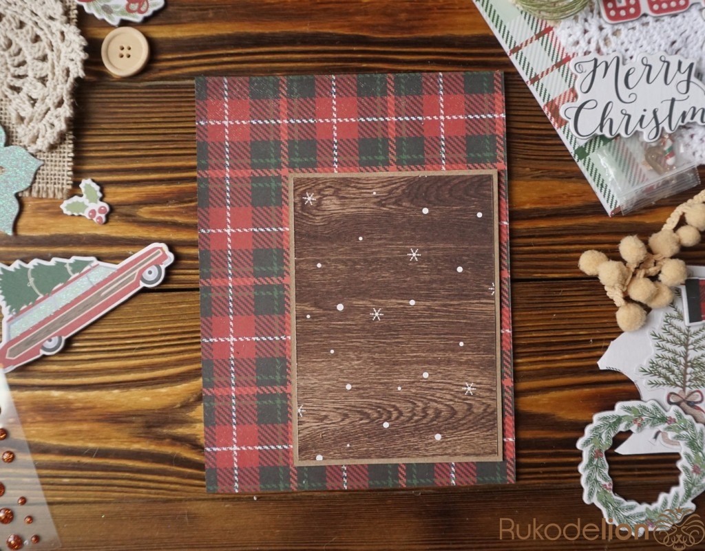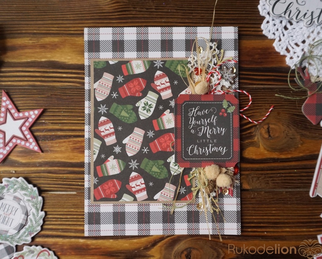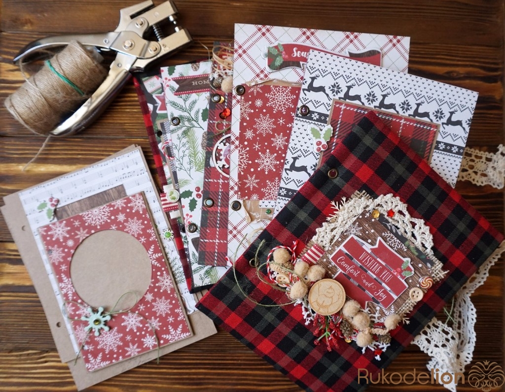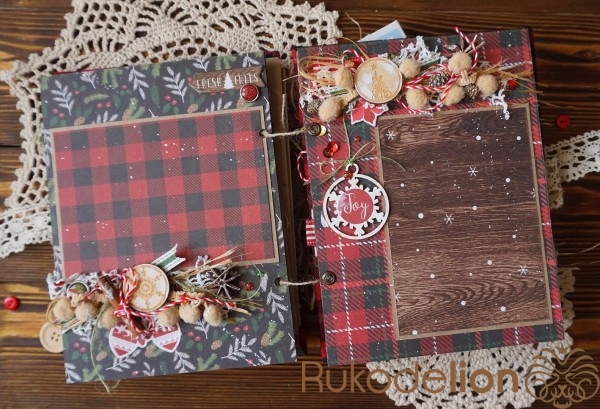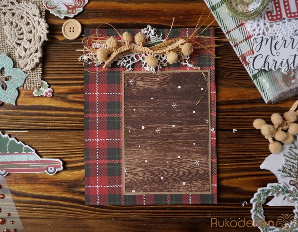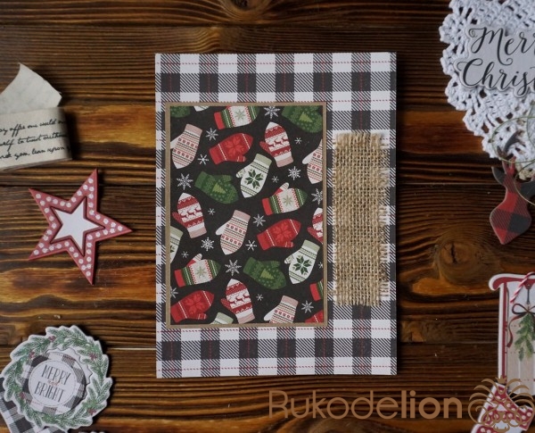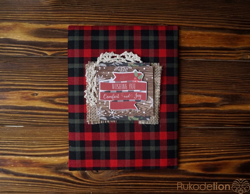 В работе использовала красивую коллекцию "Comfort and Joy" от MME (набор бумаги и чипборд), мешковину, рафию, маленькие шишечки, деревянные фишки и чипборд, брадсы и мелкий декор вроде пайеток.