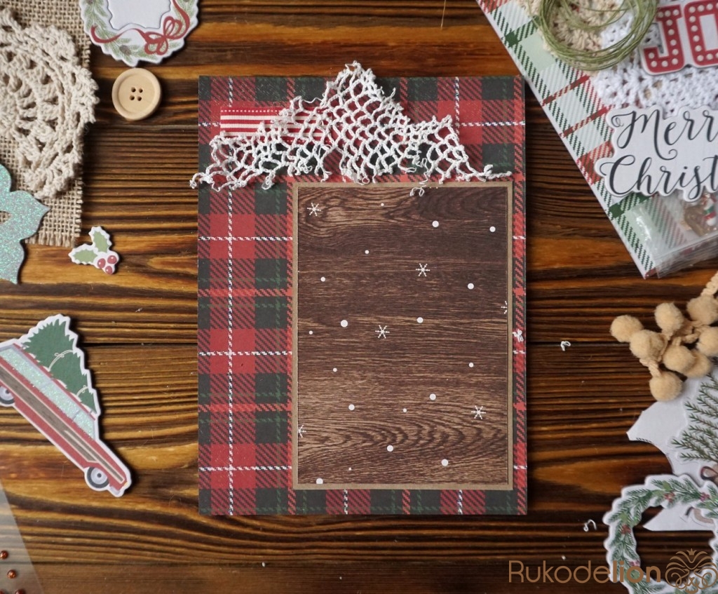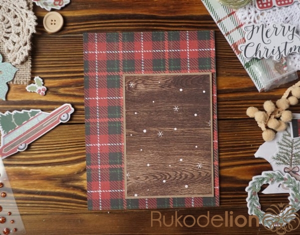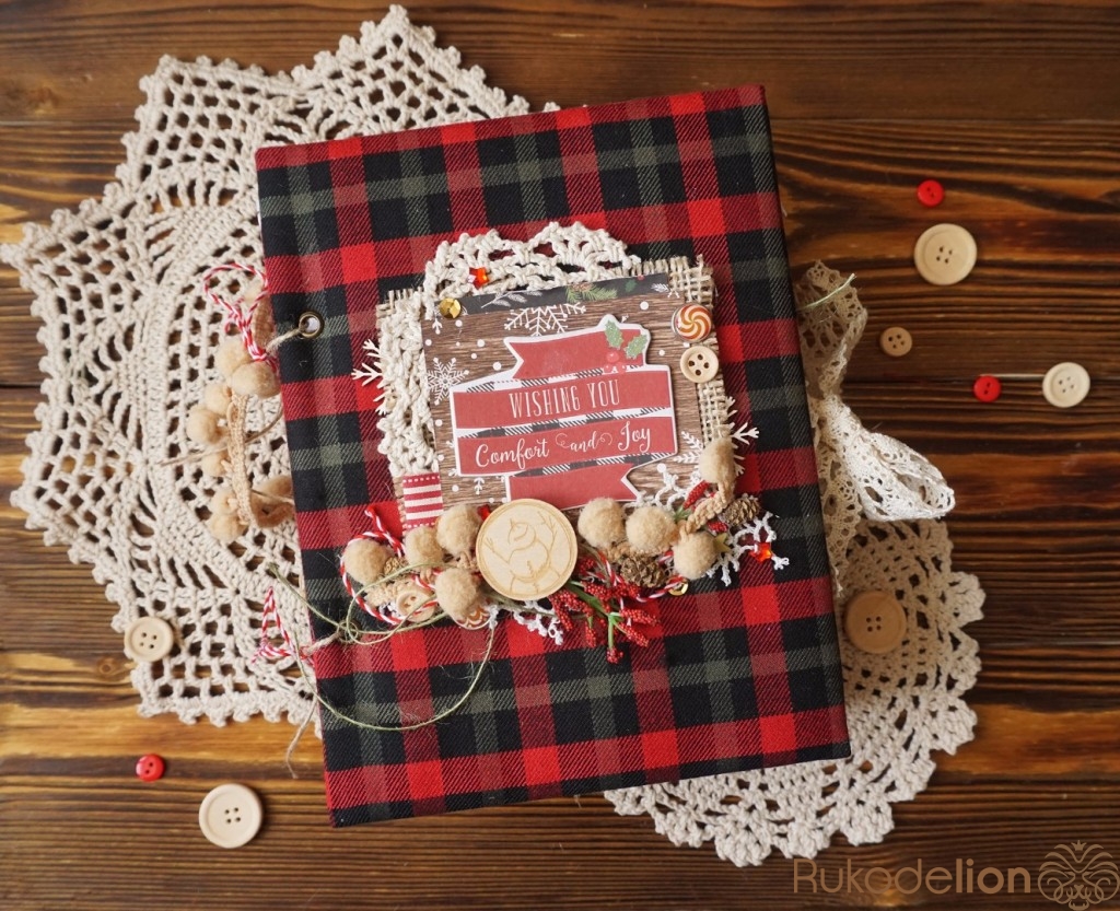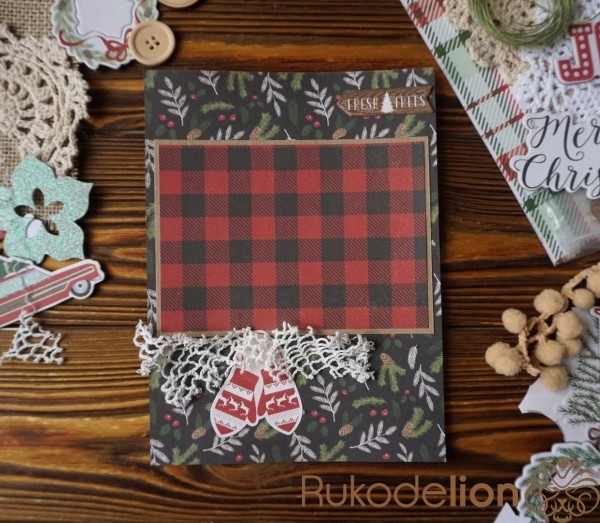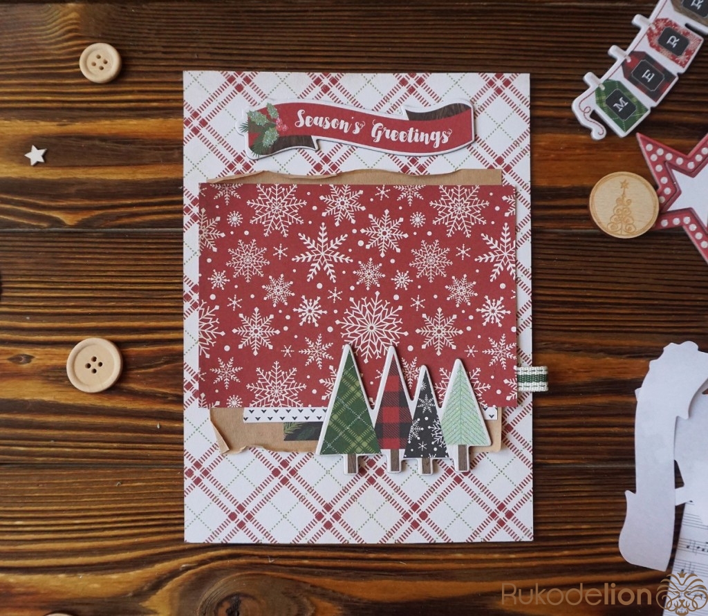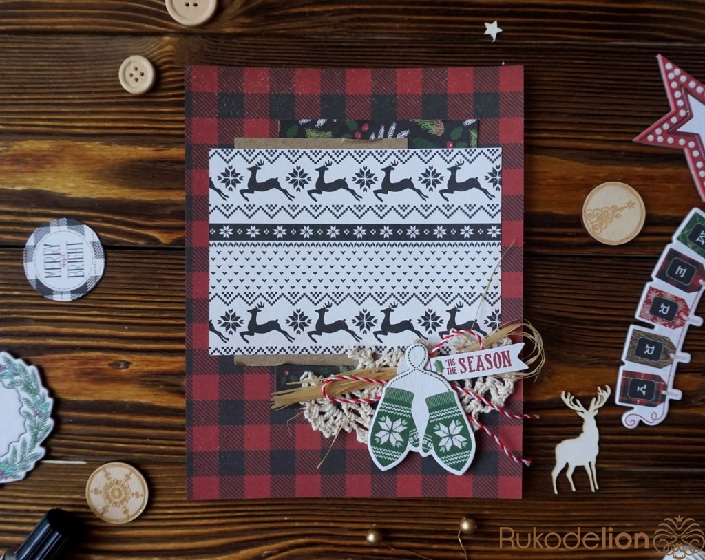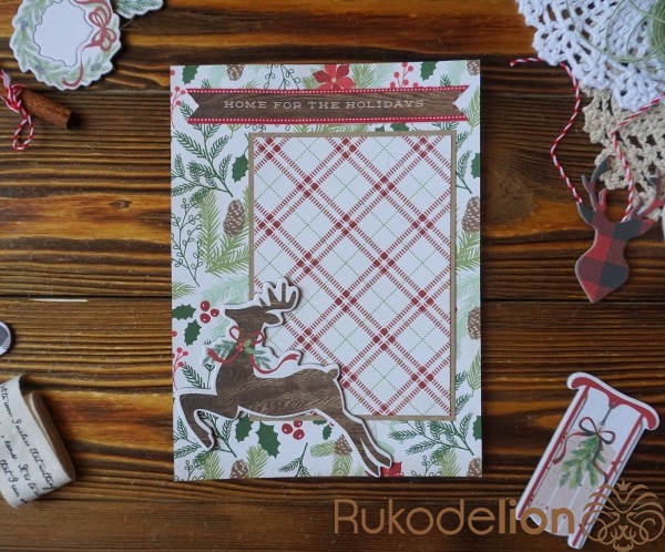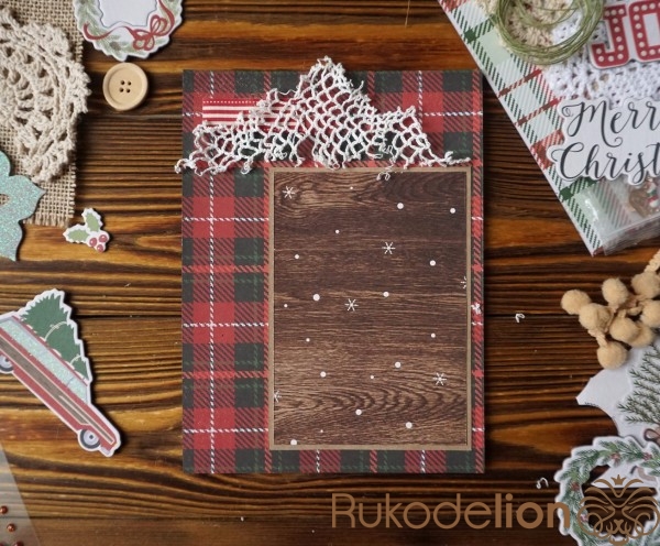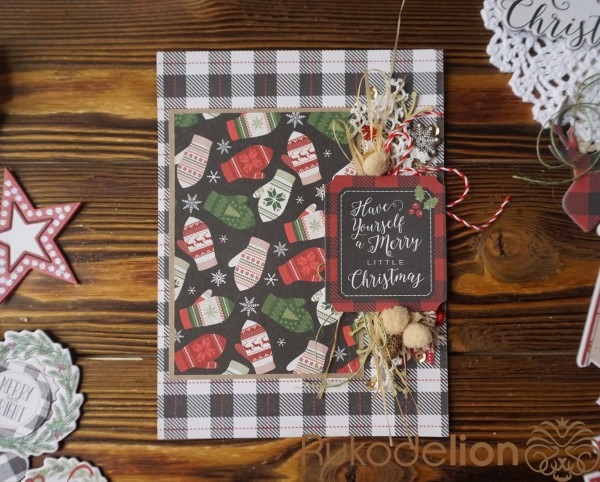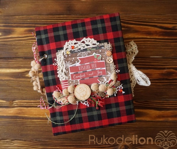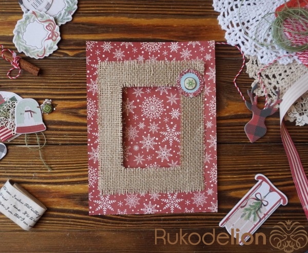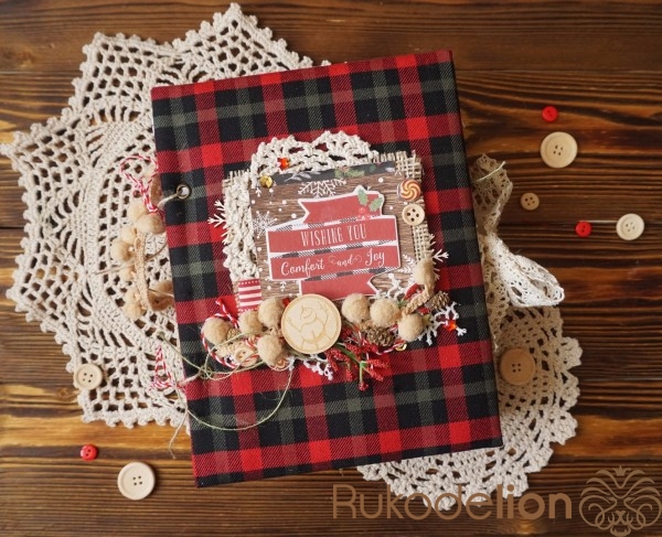 В работе использовала красивую коллекцию "Comfort and Joy" от MME (набор бумаги и чипборд), мешковину, рафию, маленькие шишечки, деревянные фишки и чипборд, брадсы и мелкий декор вроде пайеток.
