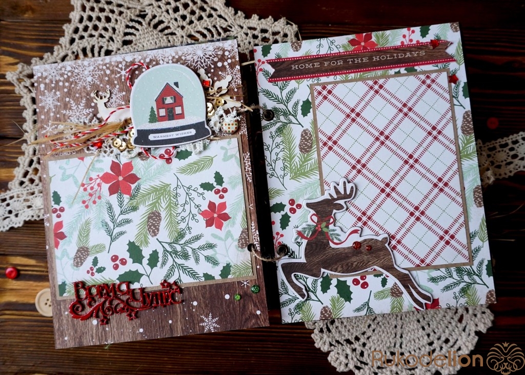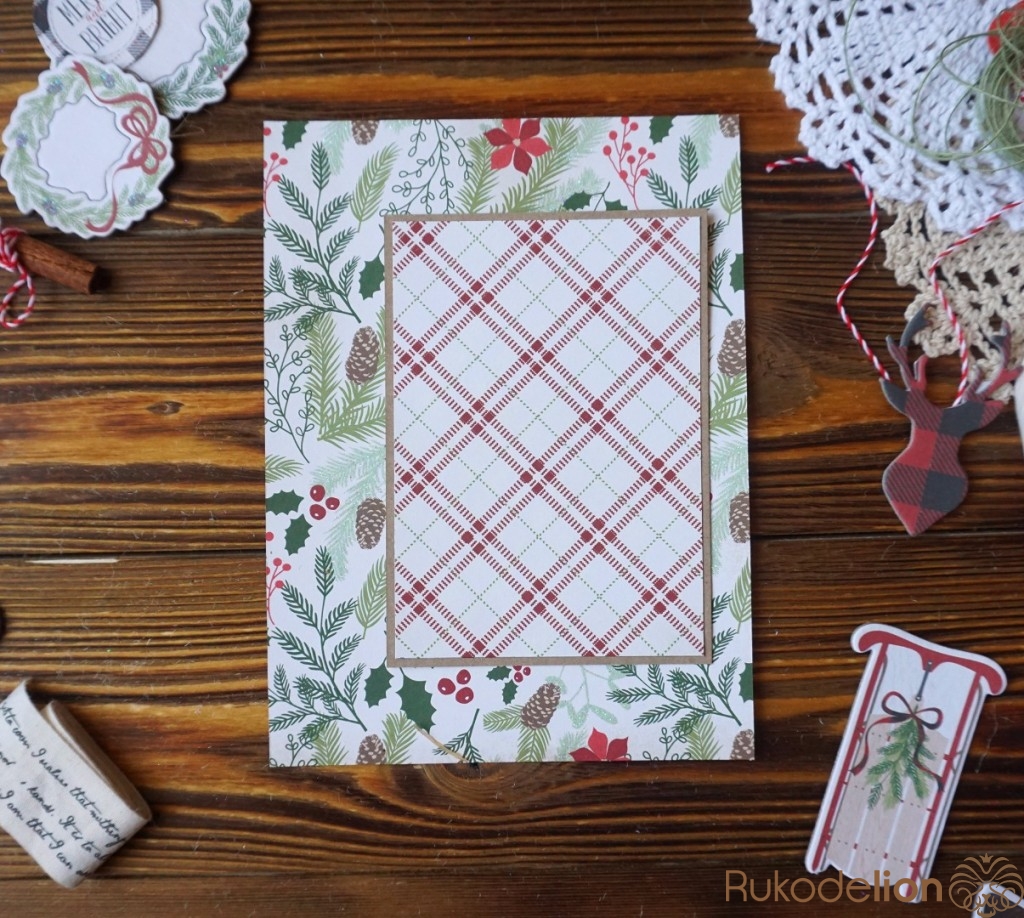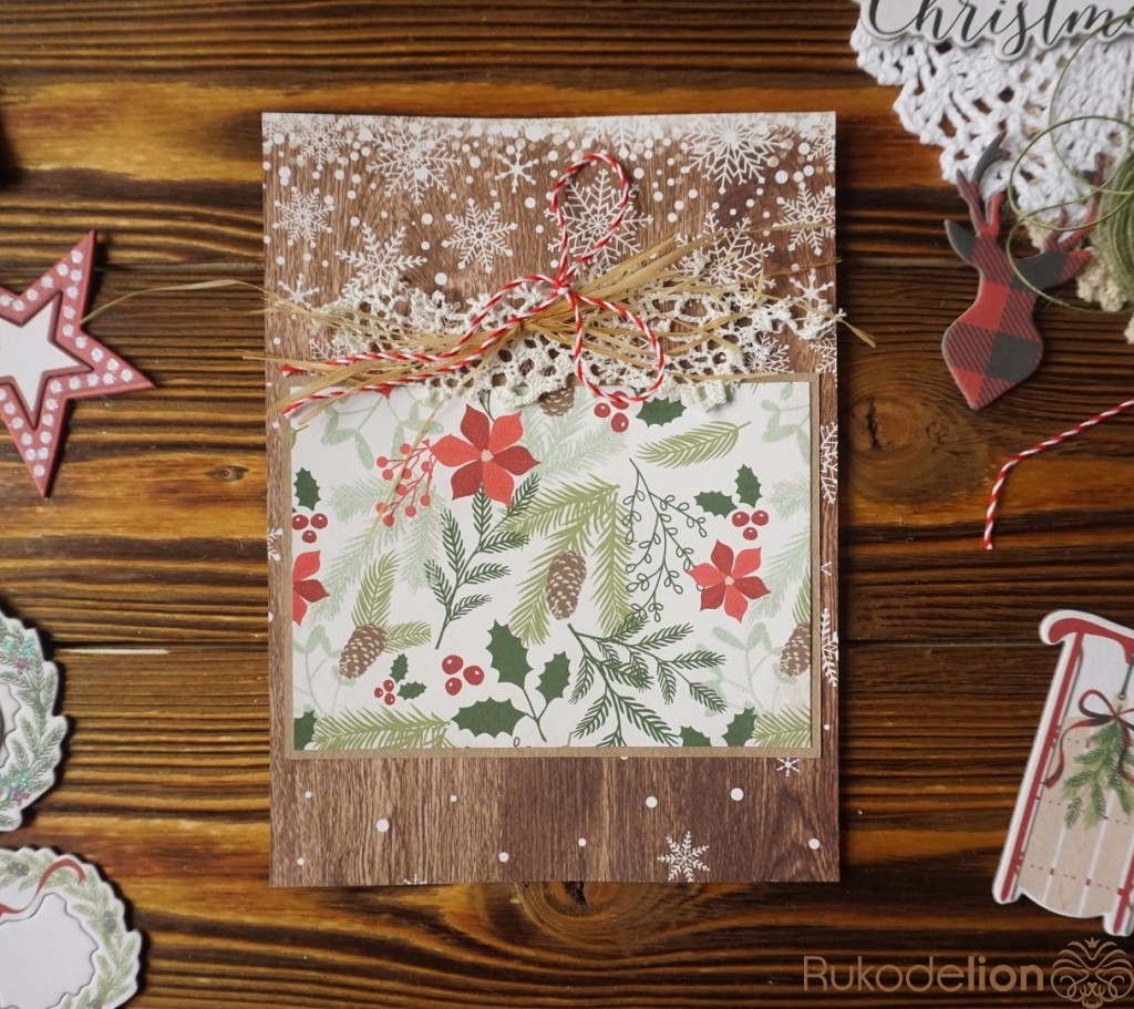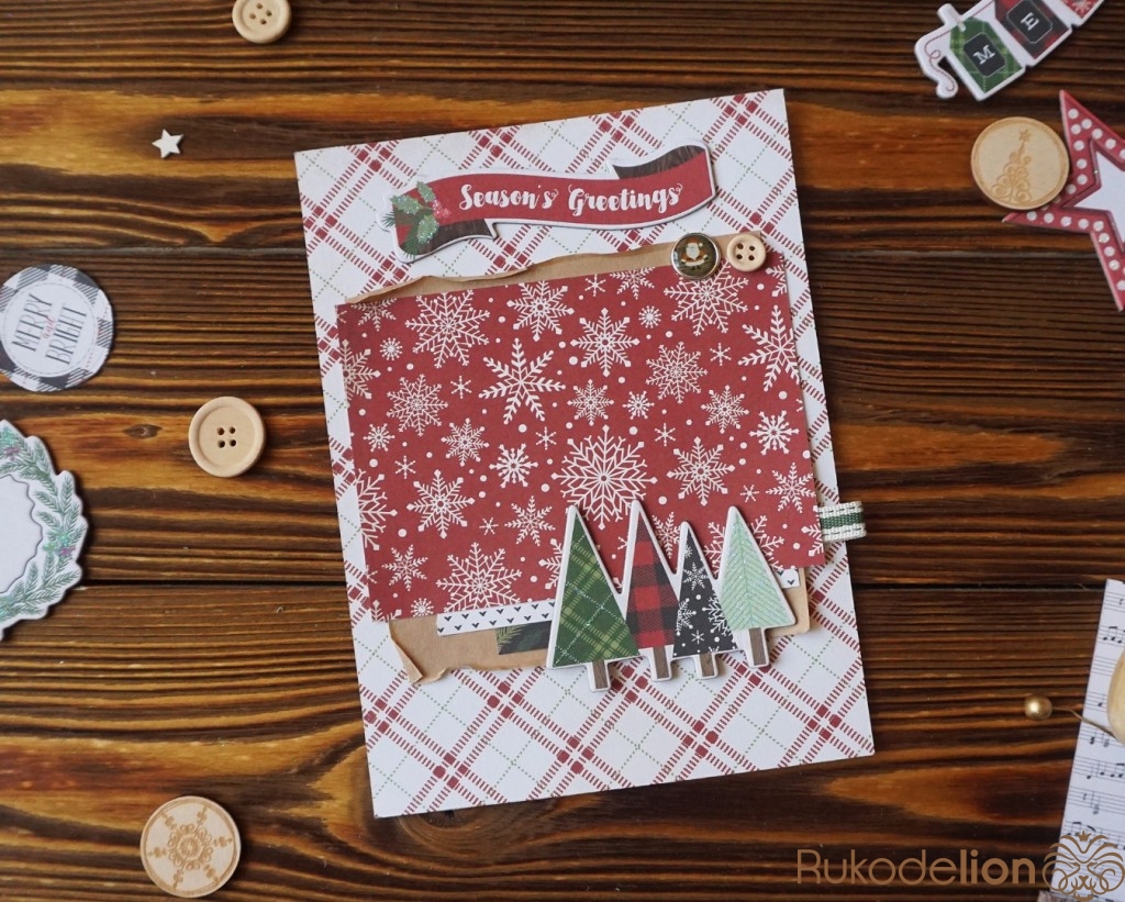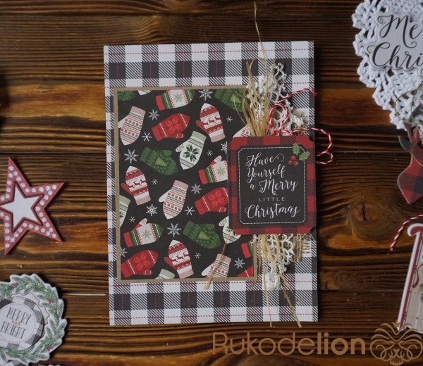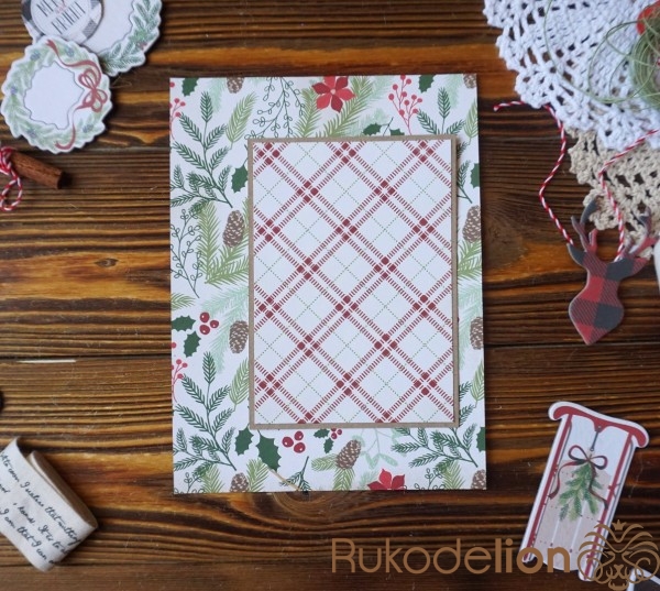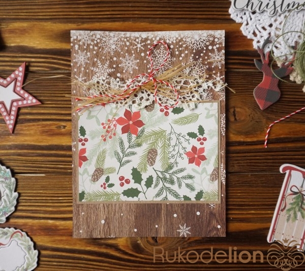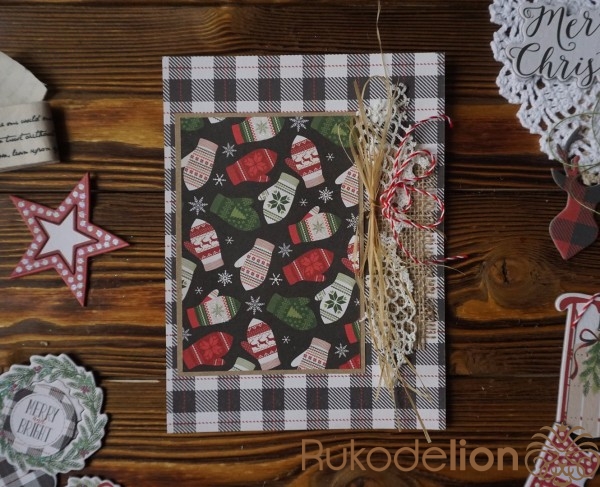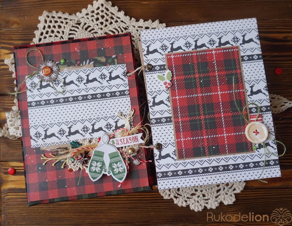 В работе использовала красивую коллекцию "Comfort and Joy" от MME (набор бумаги и чипборд), мешковину, рафию, маленькие шишечки, деревянные фишки и чипборд, брадсы и мелкий декор вроде пайеток.