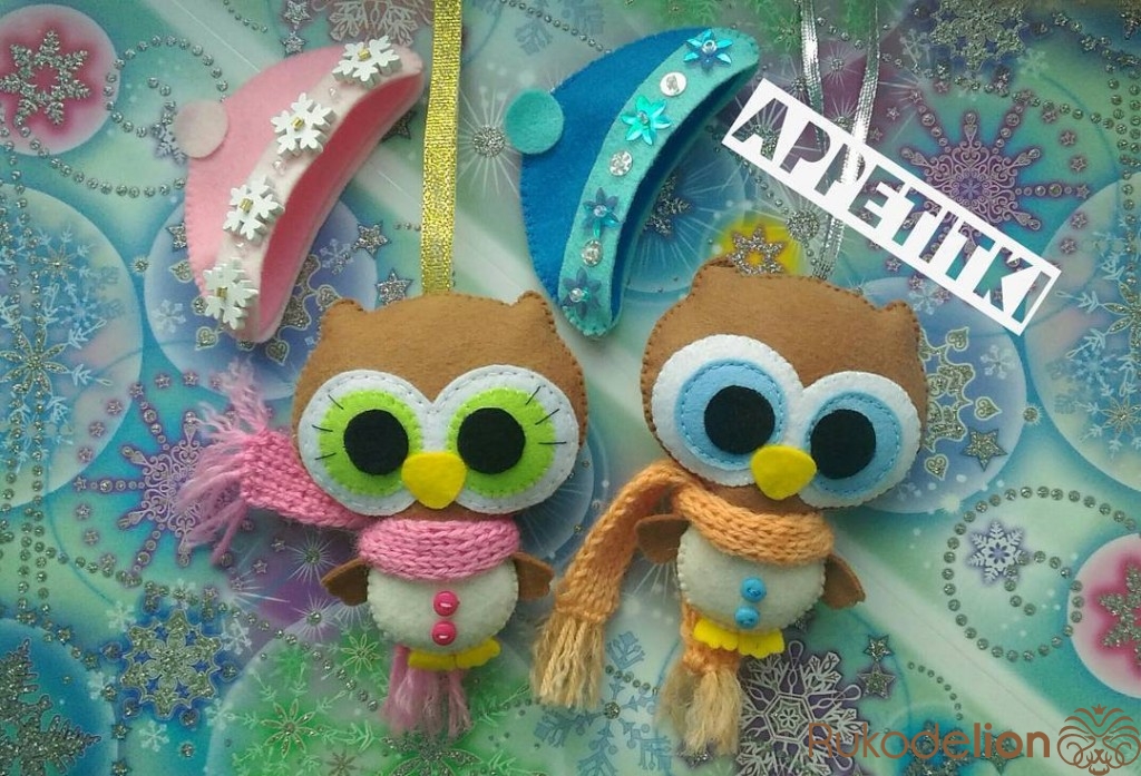 Елочные игрушки совята сшиты полностью вручную (без использования швейной машинки) из фетра. Украшены пуговицами, паетками, бисером. Шарфики вязаные. Шапочки снимаются.