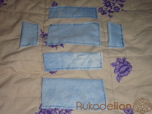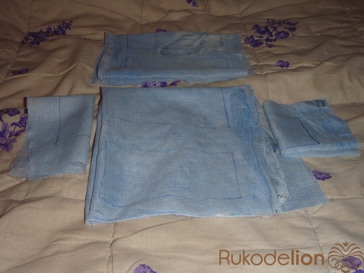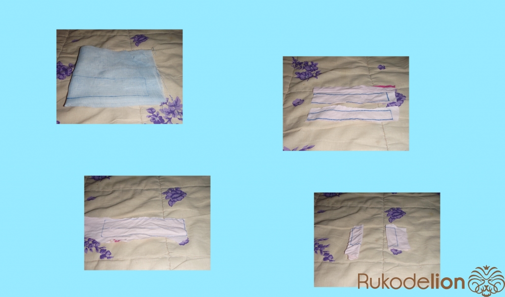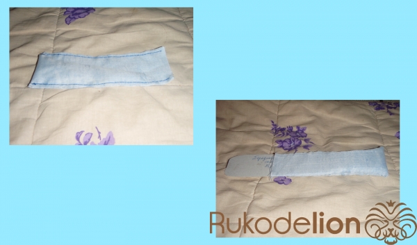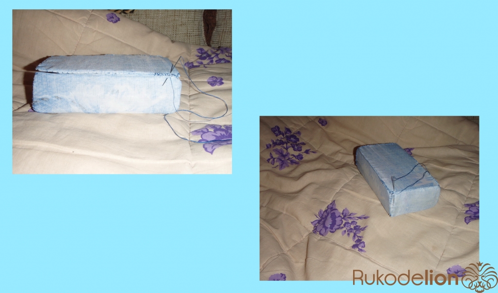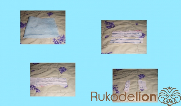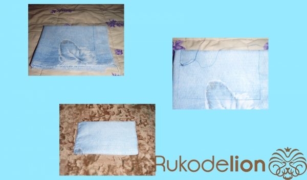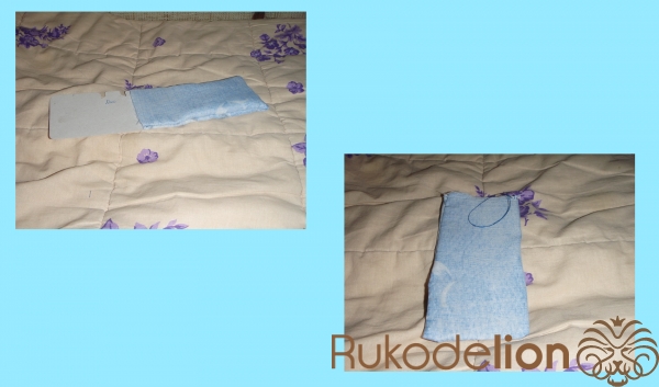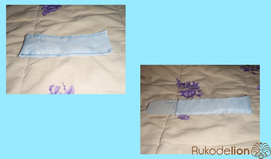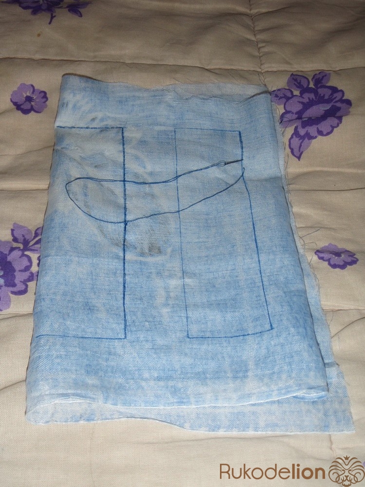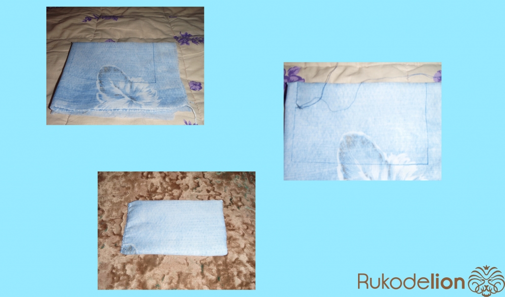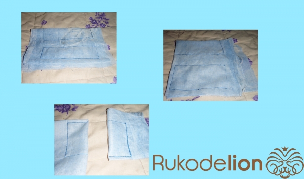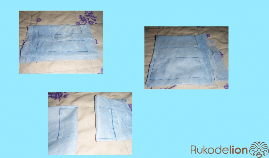 2.1)  Это - будущий чехол для передней части спинки. Здесь тканевой сгиб сложенной материи у нас уже небольшой - он выпал на короткую линию-сторону будущего чехла. Его можно увидеть в левой части голубой материи. Поэтому - линии для прошивания у нас теперь в другом расположении: длинная + вторая длинная. Прошиваем швом "за иголку" одну длинную линию, затем (после закрепления нити узелком) - ещё одну, параллельную ей.