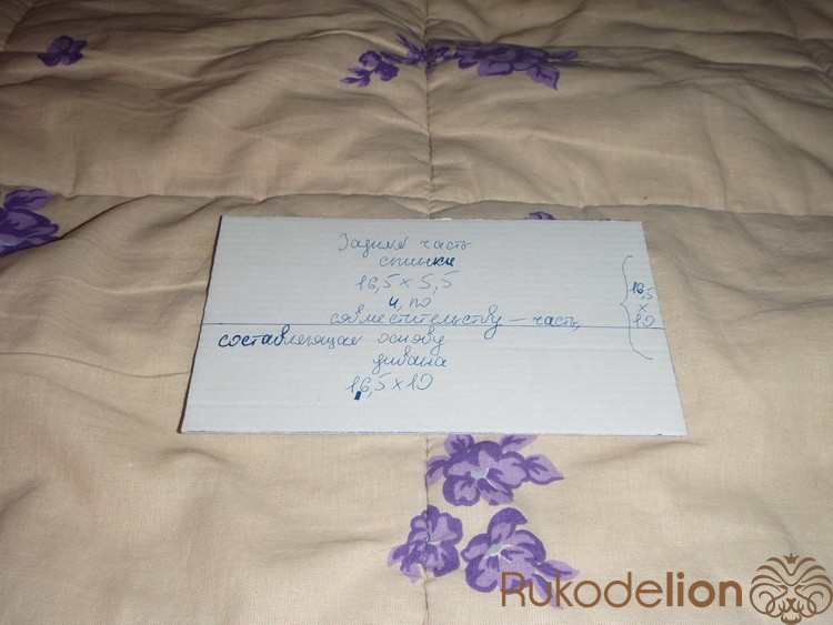 1) Теперь пришла пора изготавливать спинку дивана. На фото - картонная часть-каркас, выполняющая сразу две функции. Когда эта "несущая конструкция" окажется в своём чехле, к её верхней части будет прикрепляться - путём пришивания - будущая объёмная спинка дивана, которую создадим уже очень скоро. К нижней же части прикрепляется - также с помощью пришивания - уже созданное, сидение дивана.