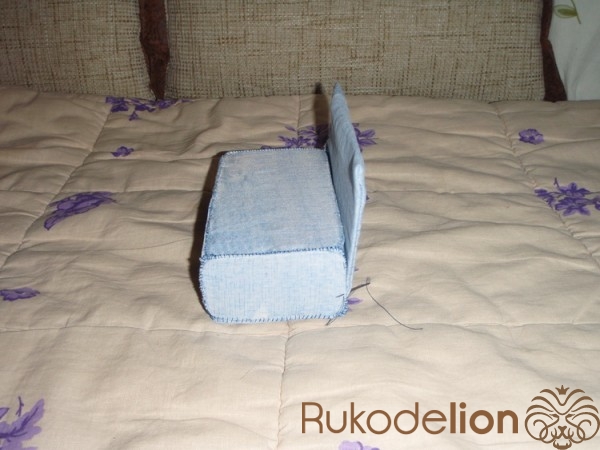 3.1) Что же нужно сделать дальше? Собрать все эти - пока ещё разрозненные - части, воедино, в одно сидение: объёмный прямоугольничек. Сшиваем каждую из этих частей вместе: главная часть - вверху, к ней пришиваем переднюю (как на фото), далее - все остальные: боковые, заднюю и дно. Пришивать их друг к другу можно в любом очерёдном порядке. Шитьё осуществляется просто прямыми вертикальными стежками - выполняемыми почти по той же технике, что и "петельный шов", только здесь стежки являются просто вертикальными и расположенными рядом друг с другом. Подобных стежков вполне достаточно для скрепления всех частей.