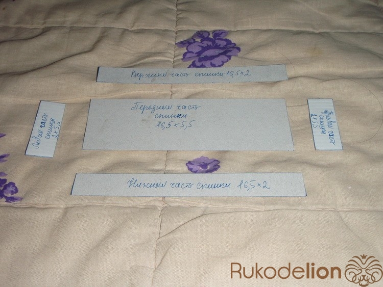2.3) С чехлом для верхней части спинки повезло больше - здесь материи хватило :-). На фото - вид материи с изнанки. Нарисованная модель - примерно совпадает с моделями предыдущих чехлов, только здесь она - в развёрнутом виде. Вырезав эту модель, мы её заранее вывернем на лицевую сторону, согнём по центральной горизонтальной линии, и также будем сшивать швом "петельным".