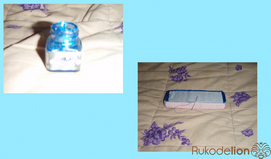 1.2) Вот картонное дно уже и внутри чехла. Теперь - требуется скрепить ту часть, которая ранее служила отверстием для вставки картонного каркаса. Скрепляем её швом "петельным", как на втором фото нашего коллажа.