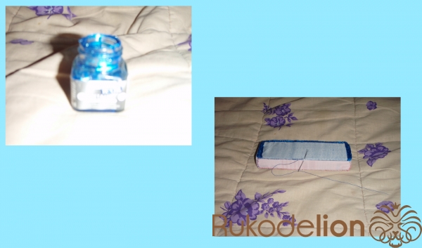 2.1) Это - синяя краска для ткани. Ею мы затем декорируем переднюю часть диванной спинки: нарисуем по её контурам три обрамляющие синие линии - для закрашивания швов, и для особенного шарма :-).