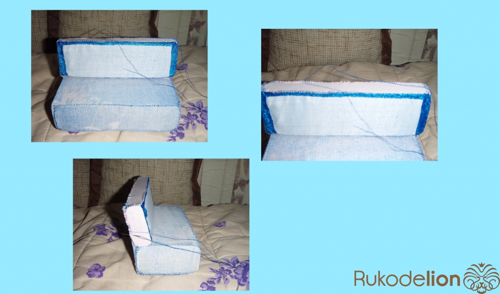 2.2) А вот тут - на следующем фото второго коллажа: работа с чехлом для верхней части спинки - существенно упростилась за счёт уже имеющегося тканевого сгиба. Он и так уже "скрепил" одну из сторон чехла - поэтому "фронт работы" значительно сократился. Вывернув чехол "на лицо" - прошиваем швом "петельным" вначале одну короткую вертикаль, затем - вставляем картон, а дальше - по той же схеме, что описана выше, для предыдущего подобного чехла: прошивка длинной горизонтали, затем - оставшейся короткой вертикали. Боковые части создаём точно таким же образом. Их чехлы по структуре совпадают с этим же чехлом.