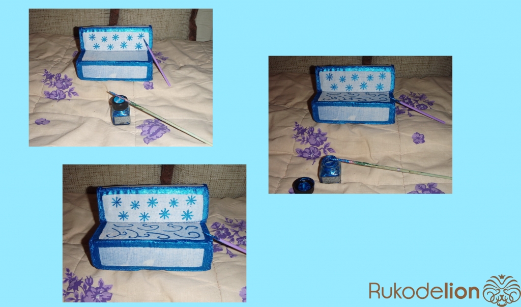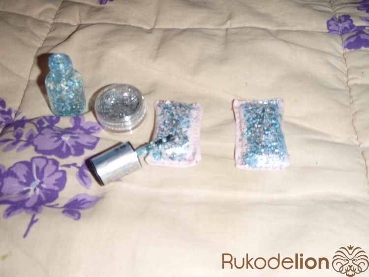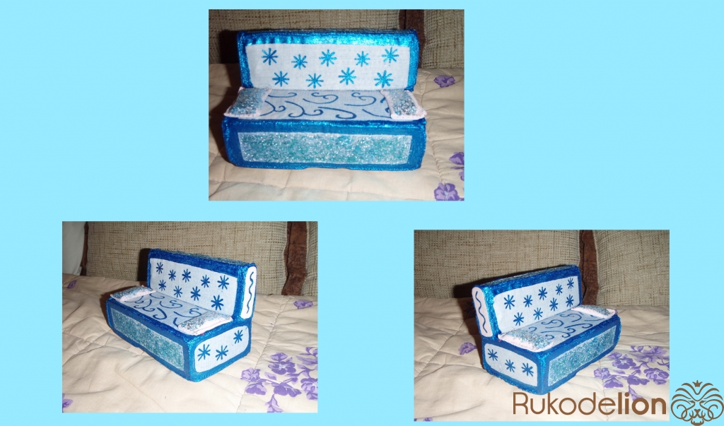 1) Примерно тем же образом декорируем две части дивана: переднюю часть сидения и верхнюю часть спинки. Красим лаком, затем - посыпаем голубыми блёстками и приглаживаем кисточкой. Наносим дополнительный закрепляющий слой лака.