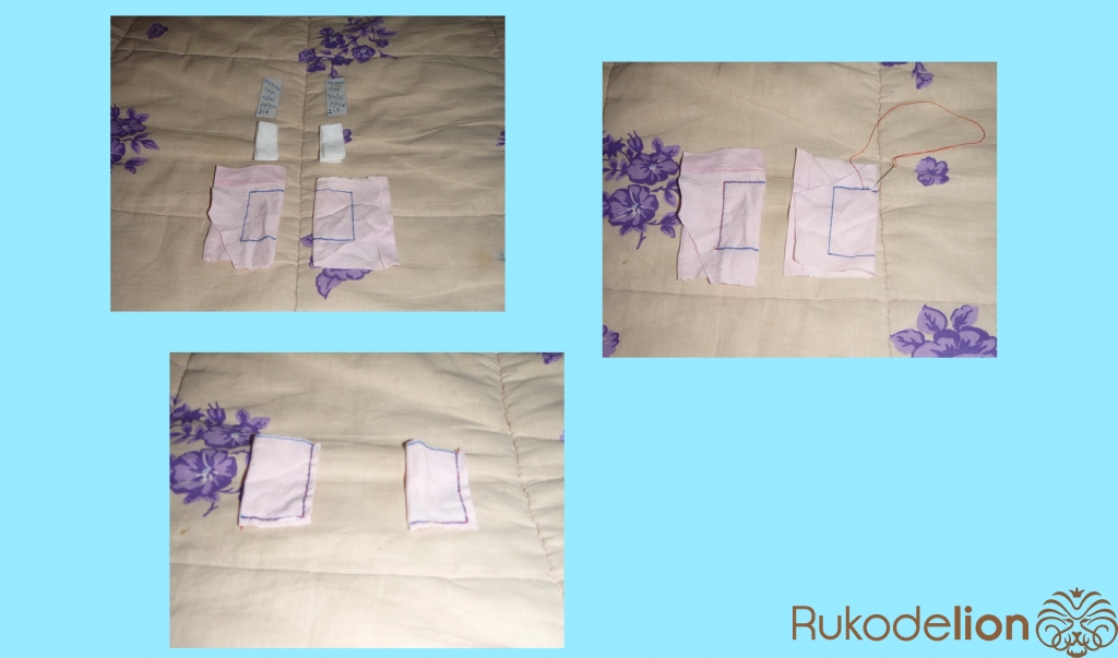2.1) А вот и наши, уже прошитые чехлы - которые затем нужно будет только вырезать, оставляя место с каждой стороны вокруг чехла: примерно по полсантиметра, можно и больше. На первом фото коллажа - крупным планом чехлы для передней и задней частей. Чехол, что расположен выше - имеет тот самый тканевой сгиб, который прошивать не нужно. Следовательно, на нём прошиты швом "за иголку" - только одна короткая и одна длинная линии. Чехол же, что находится ниже - не имеет тканевого сгиба. И из его линий, таким образом, являются прошитыми целых три: длинная-короткая-длинная.