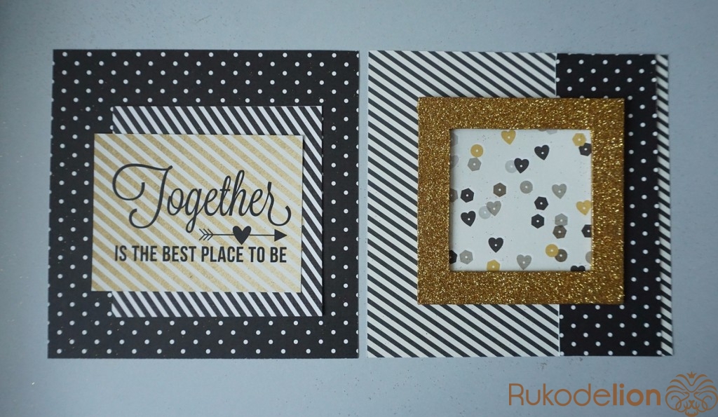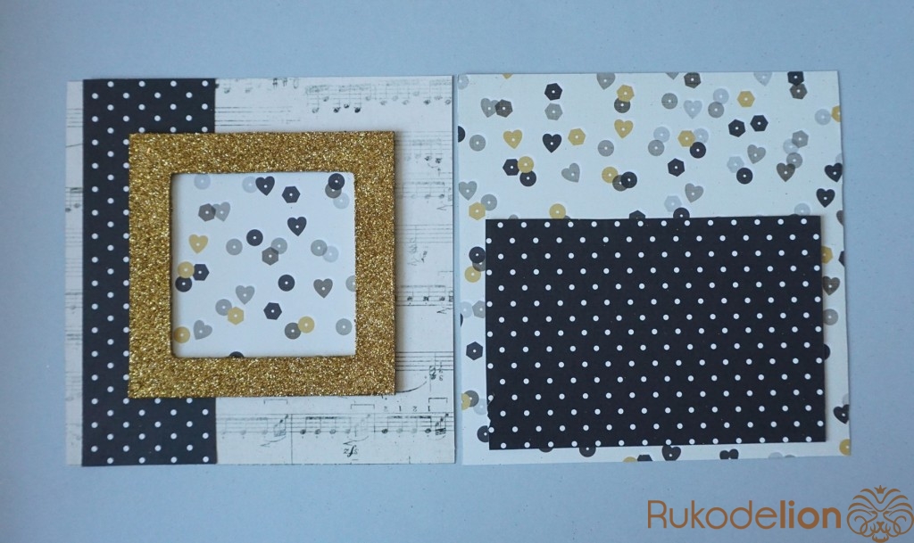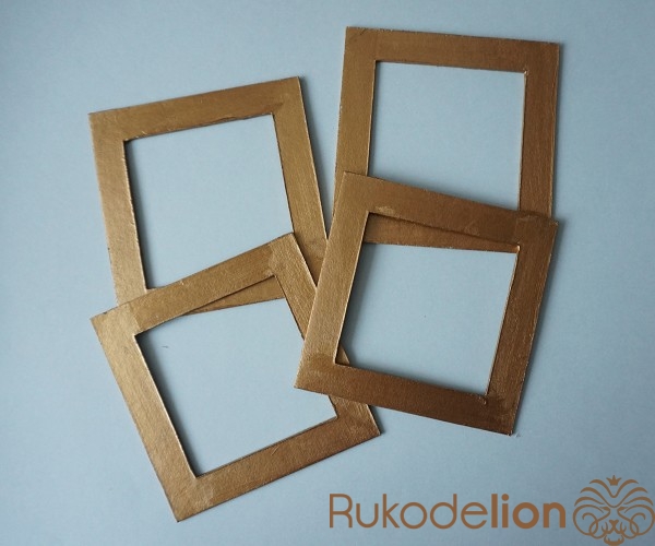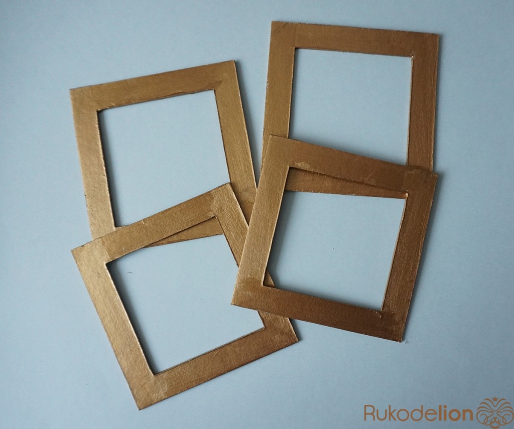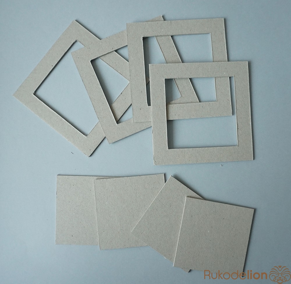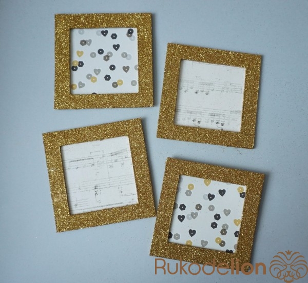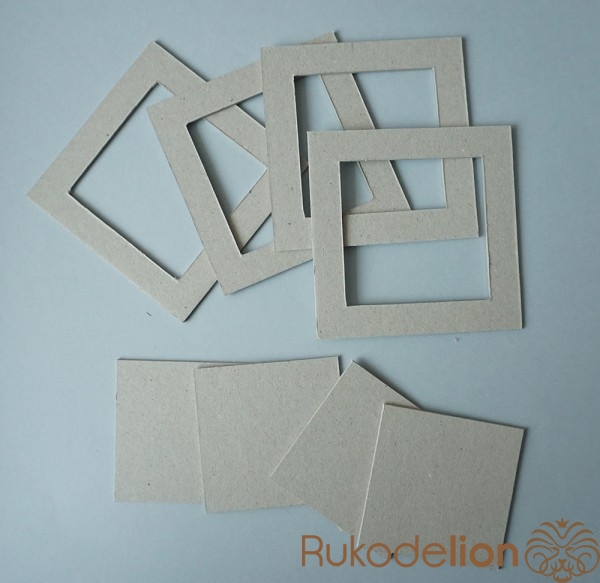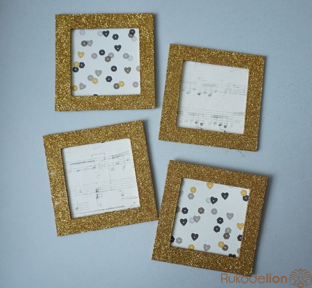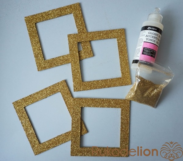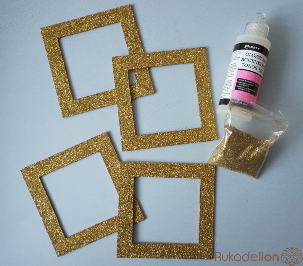 Фотографии будут размещены в красивые рамочки с глиттером. Вырезаем их из переплетного картона, у меня размером 10*10 см, толщиной 1,5 см (странички у альбома размером 15*15 см). Окрашиваем краской в тон блесткам, покрываем глосси и посыпаем блестками. Чтобы блестки не осыпались их можно закрепить лаком для волос.