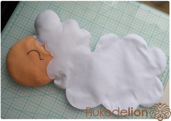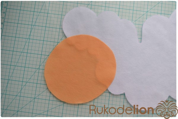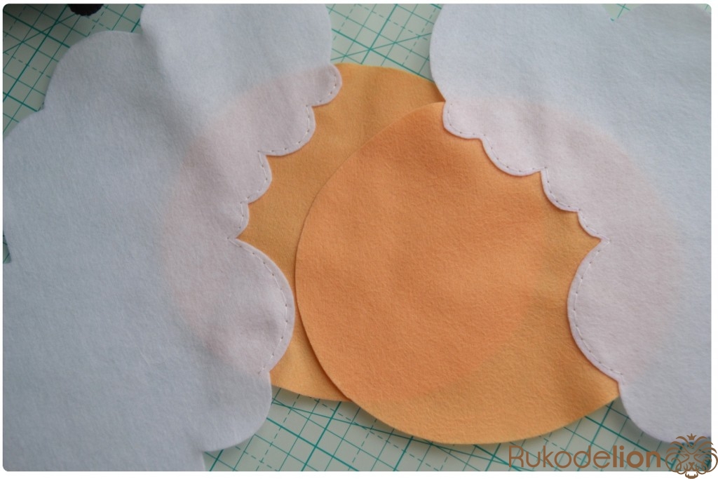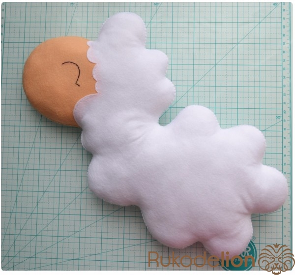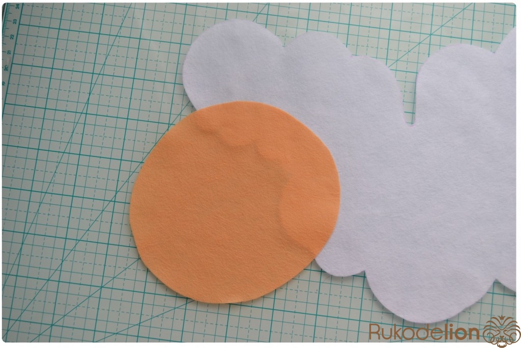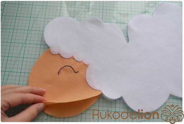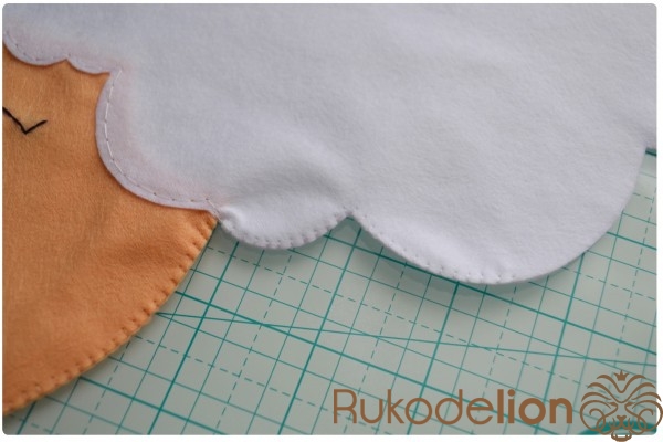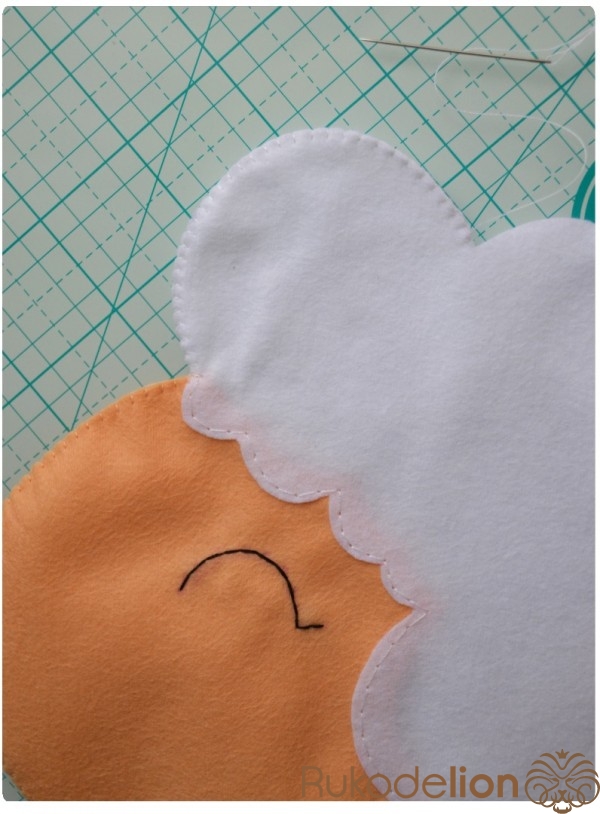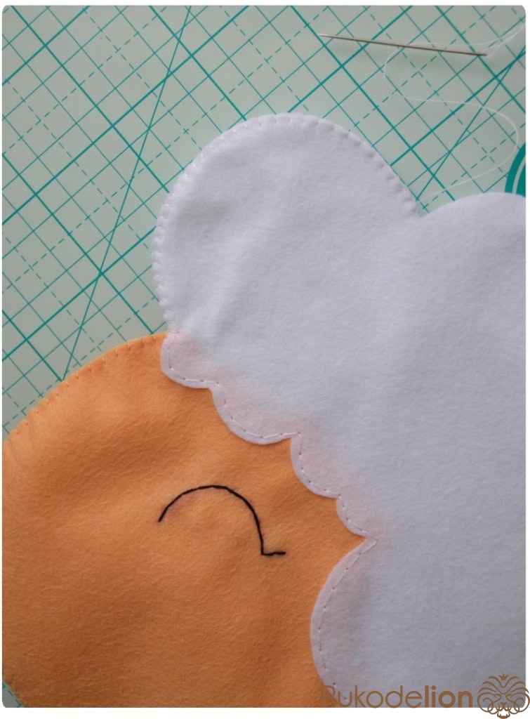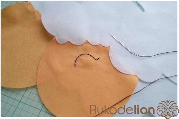 Сверху головы кладем деталь мордочки. На данном этапе мордочку можно зафиксировать на белой детали при помощи пары капель текстильного клея, временного сметочного шва или булавками