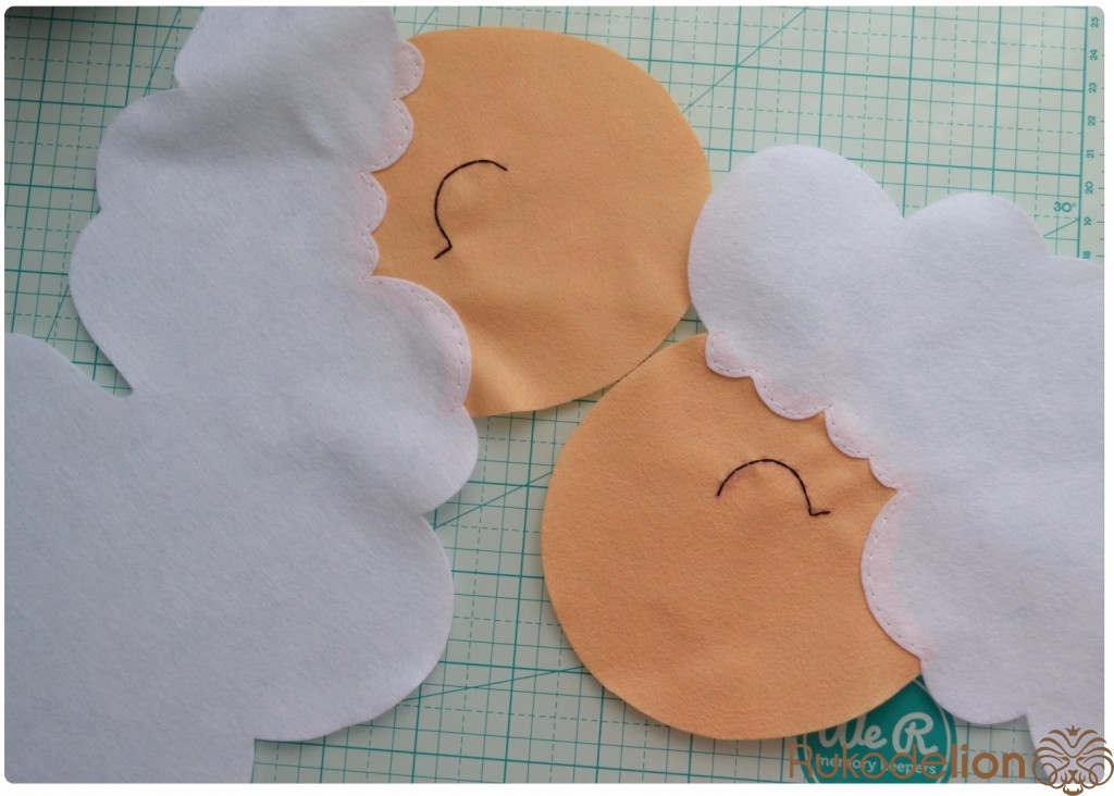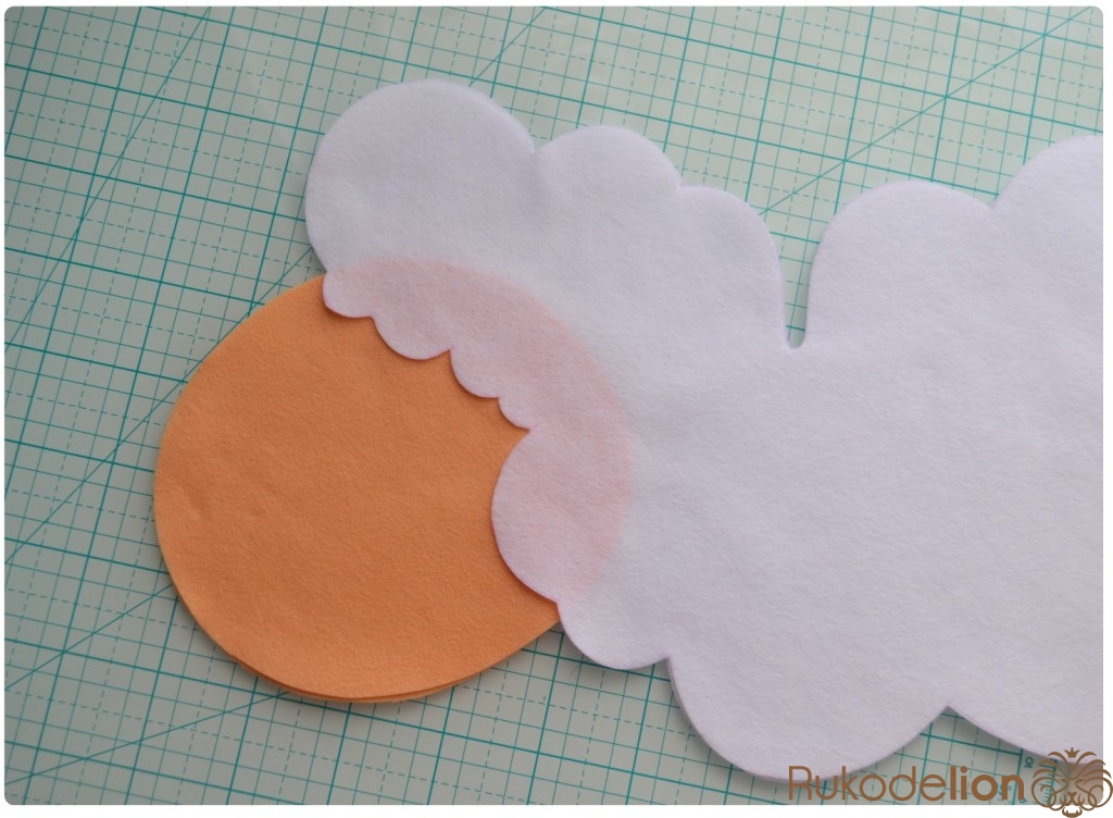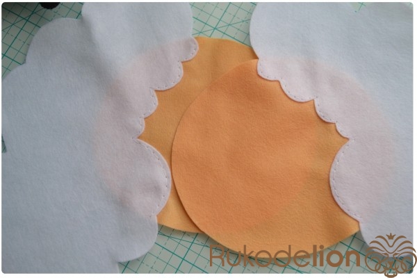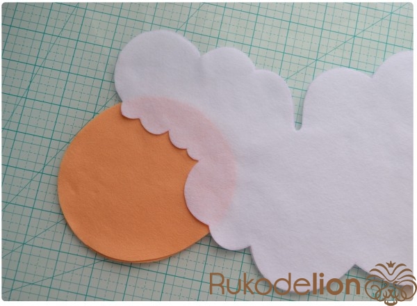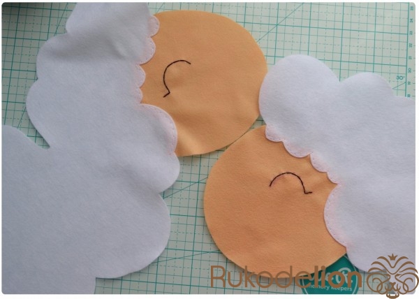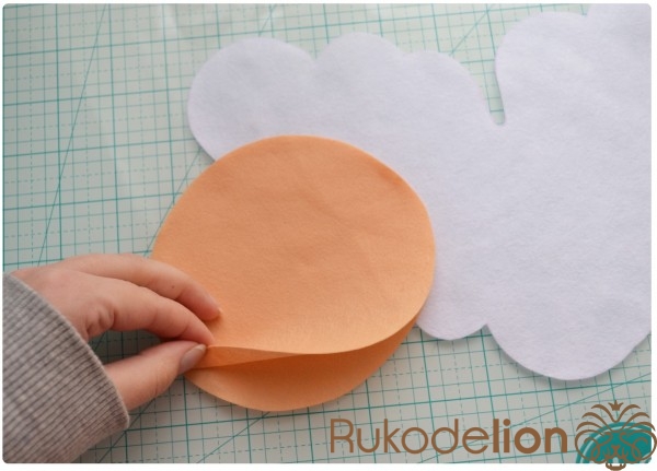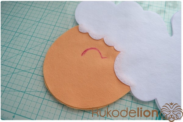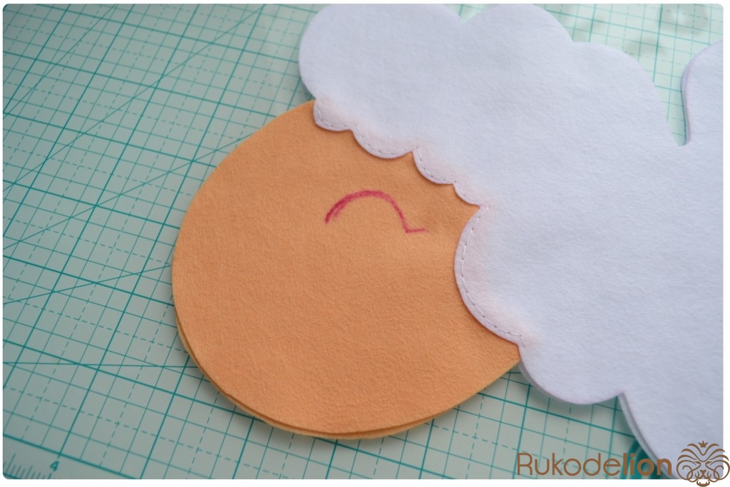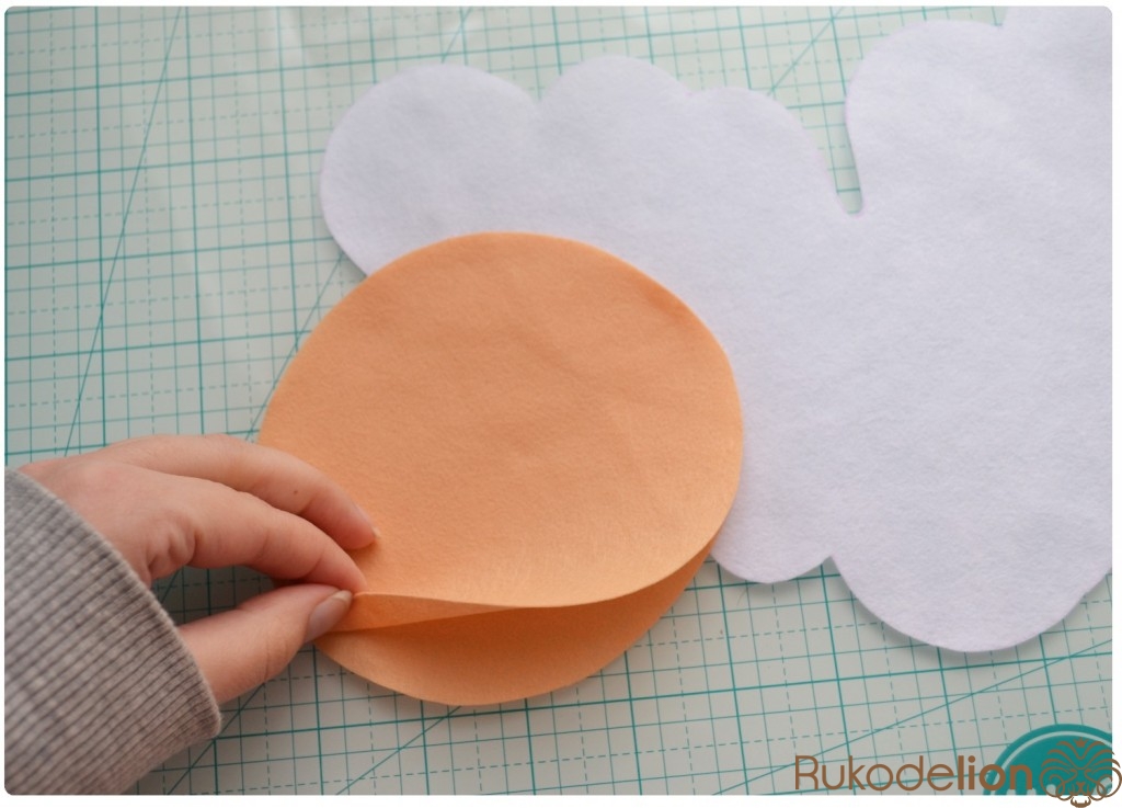 Сверху головы кладем деталь мордочки. На данном этапе мордочку можно зафиксировать на белой детали при помощи пары капель текстильного клея, временного сметочного шва или булавками