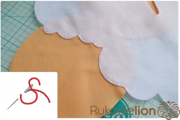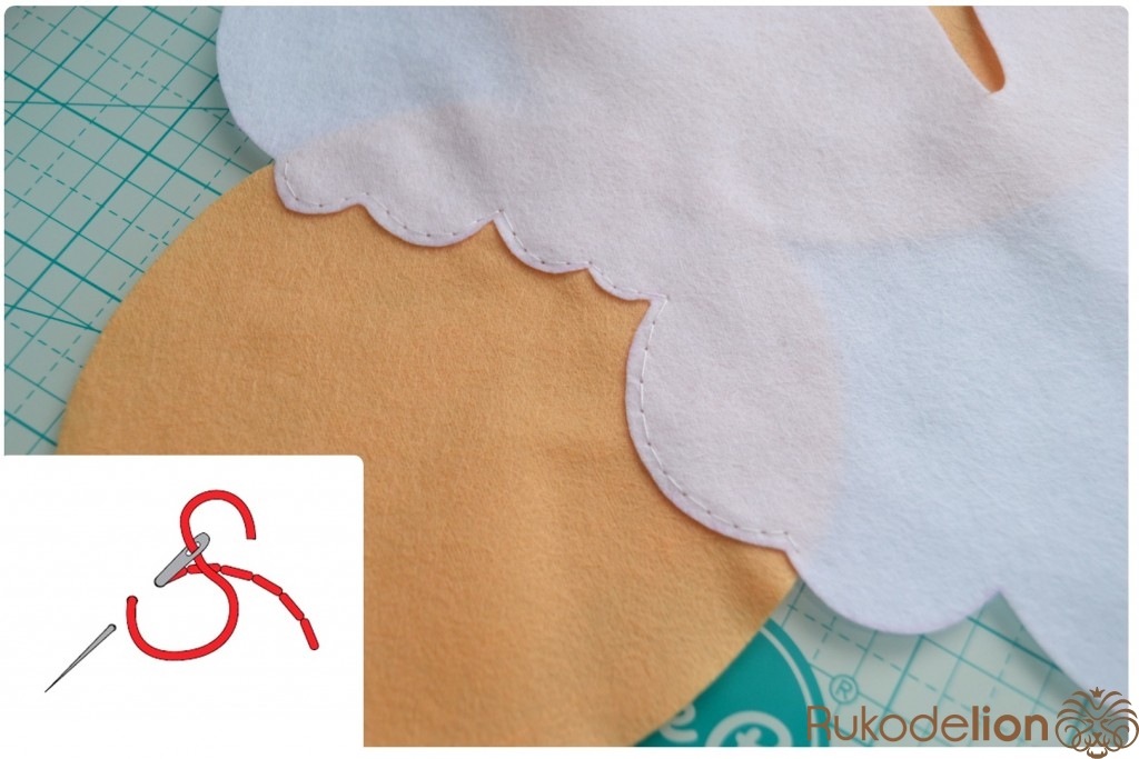 Теперь нам нужно пришить мордочки к белым деталям. Белыми нитками швом "назад иголка", как это показано на схеме, пришиваем белый край детали к бежевой