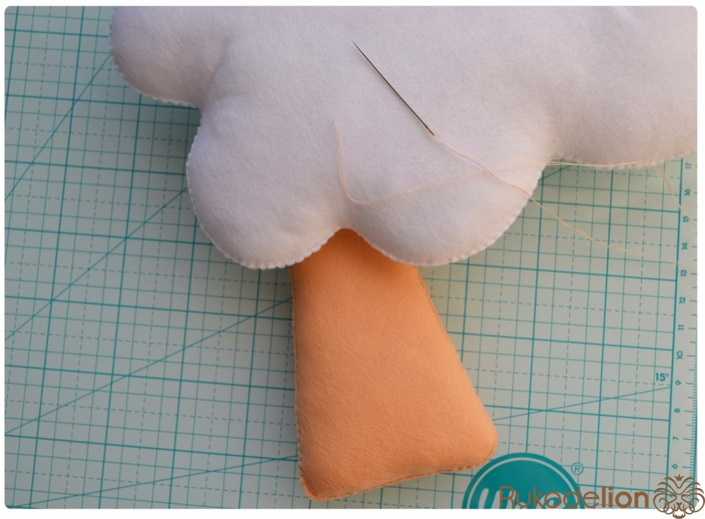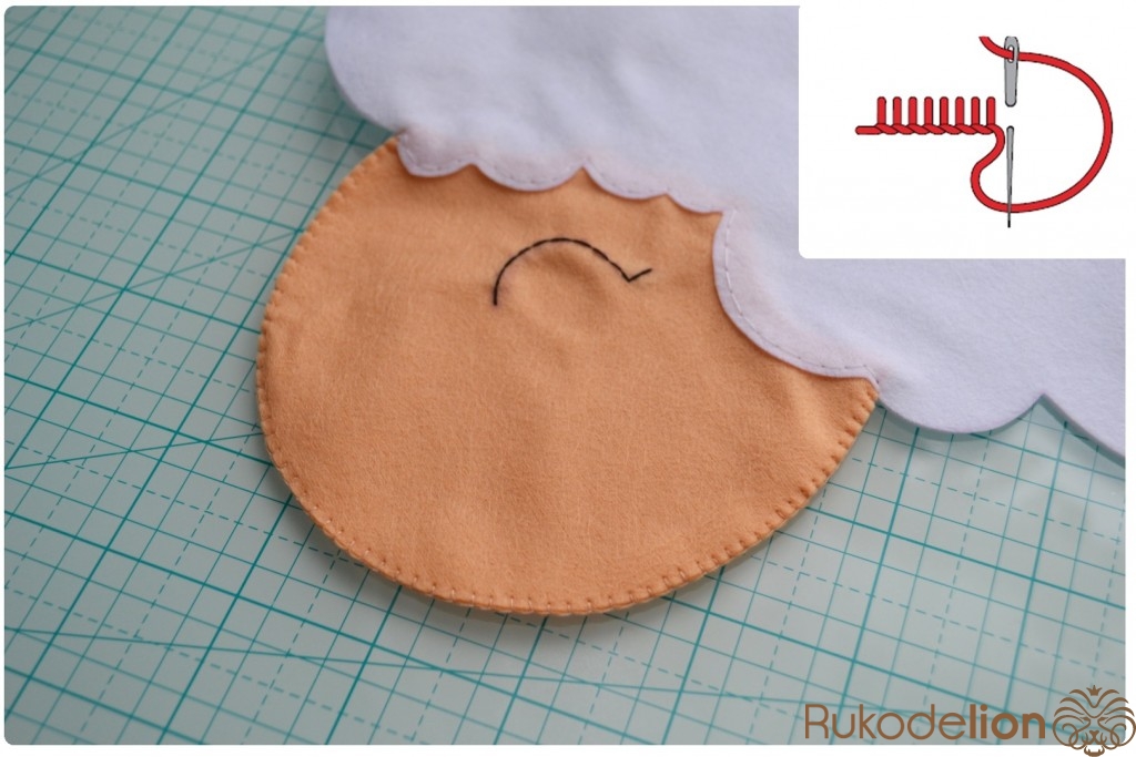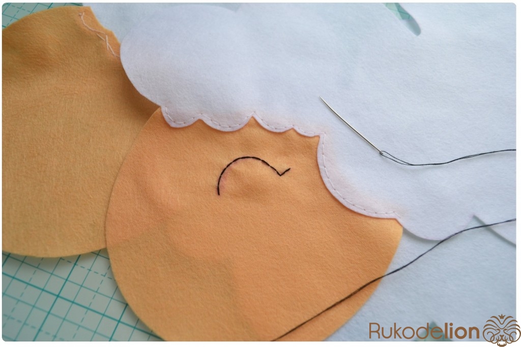 Теперь берем белую нитку с иголкой и тем же швом начинаем сшивать белую шасть овцы. Я начинаю с середины низа и иду по часовой стрелке. Когда мы дойдем до уже прошитой бежевой части, мы закончим шов и обрежем нить