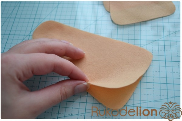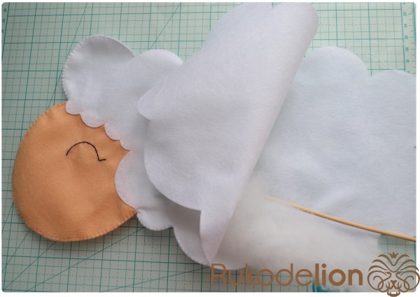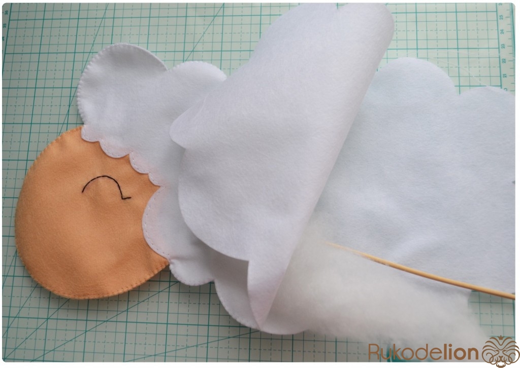 ВАЖНО: Когда вы будете набивать тело овцы синтепоном, прижимайте ее тело рукой к столу, чтобы она оставалась сравнительно плоской, а не набивалась синтепоном как колобок. Иначе ваша овечка будет кривой и с заломами фетра