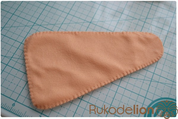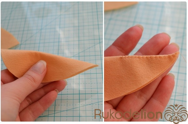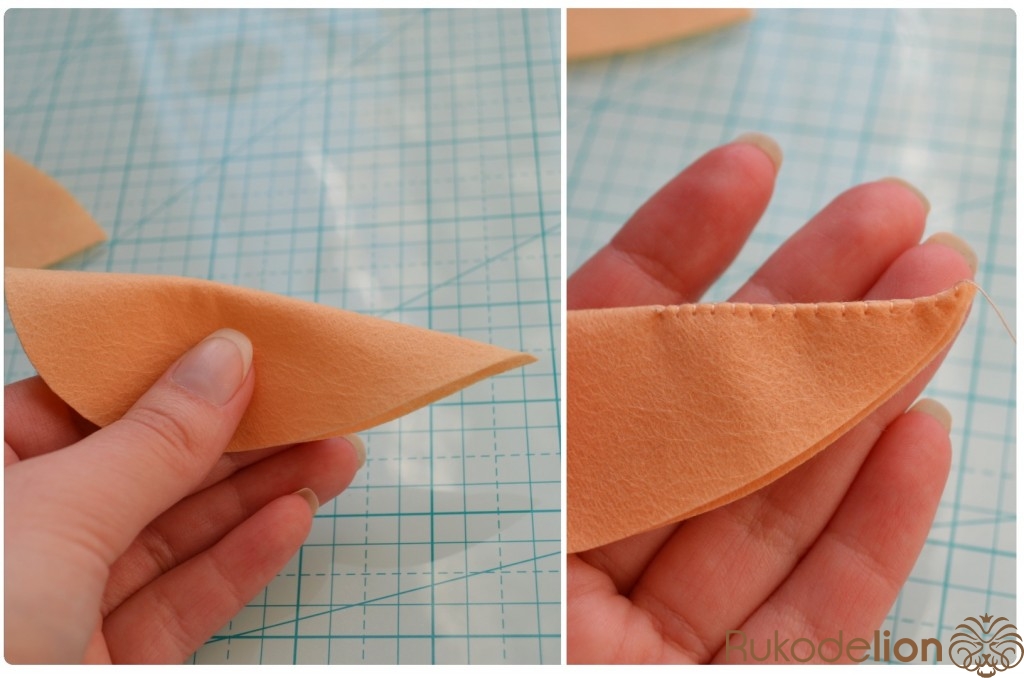Остались ушки. Берем одно ухо и сгибаем его пополам. С середины сгиба до края уха ведем бежевыми нитками мелкими стежками обметочный шов. Завязываем узелок. Нить можно пока не обрезать