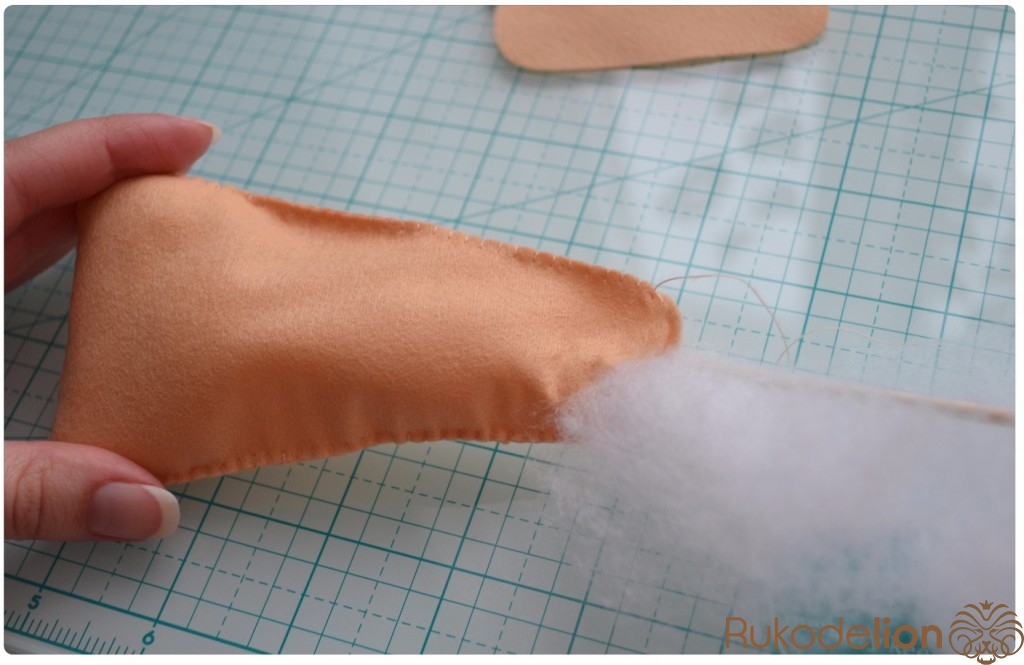 Когда наш шов дойдет до шеи, то нужно будет набить синтепоном уже прошитую часть - мордочку и голову