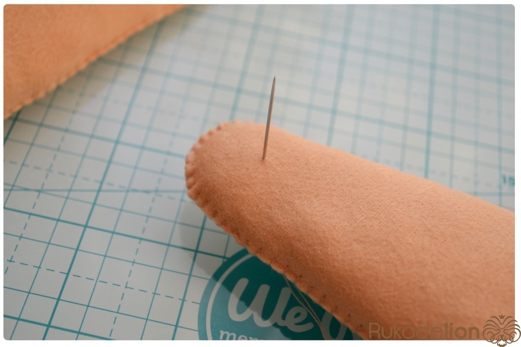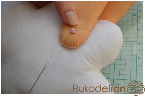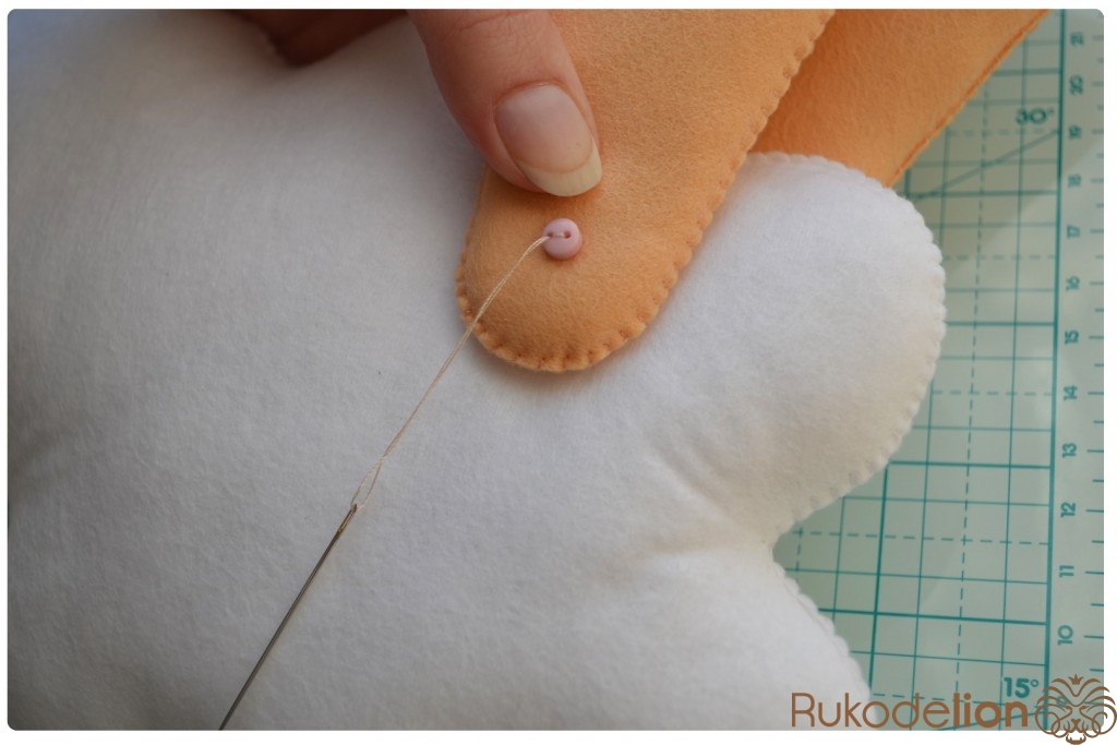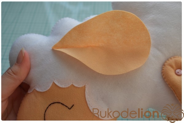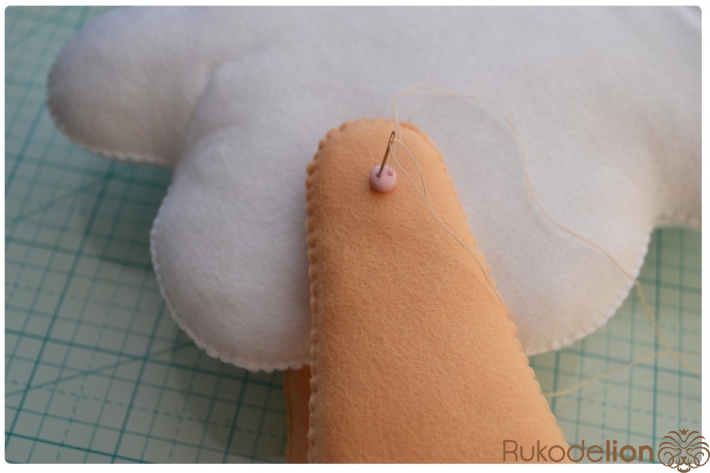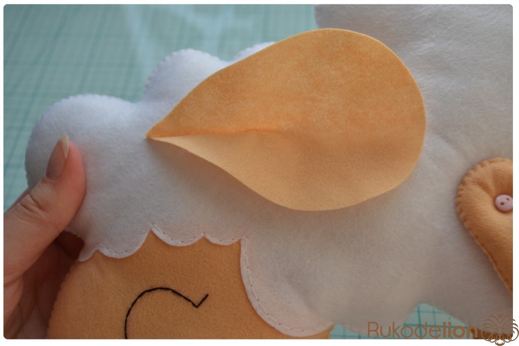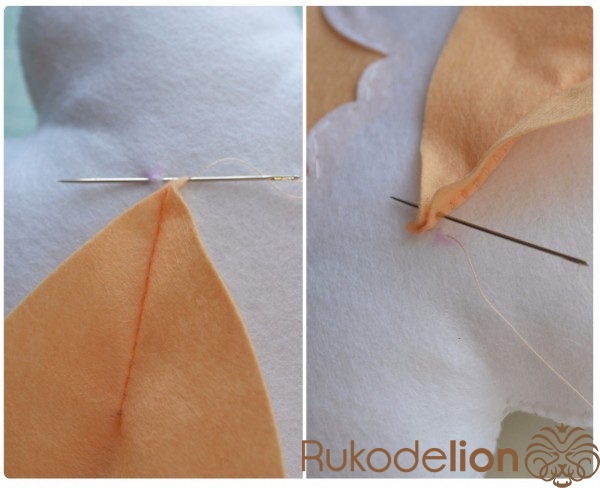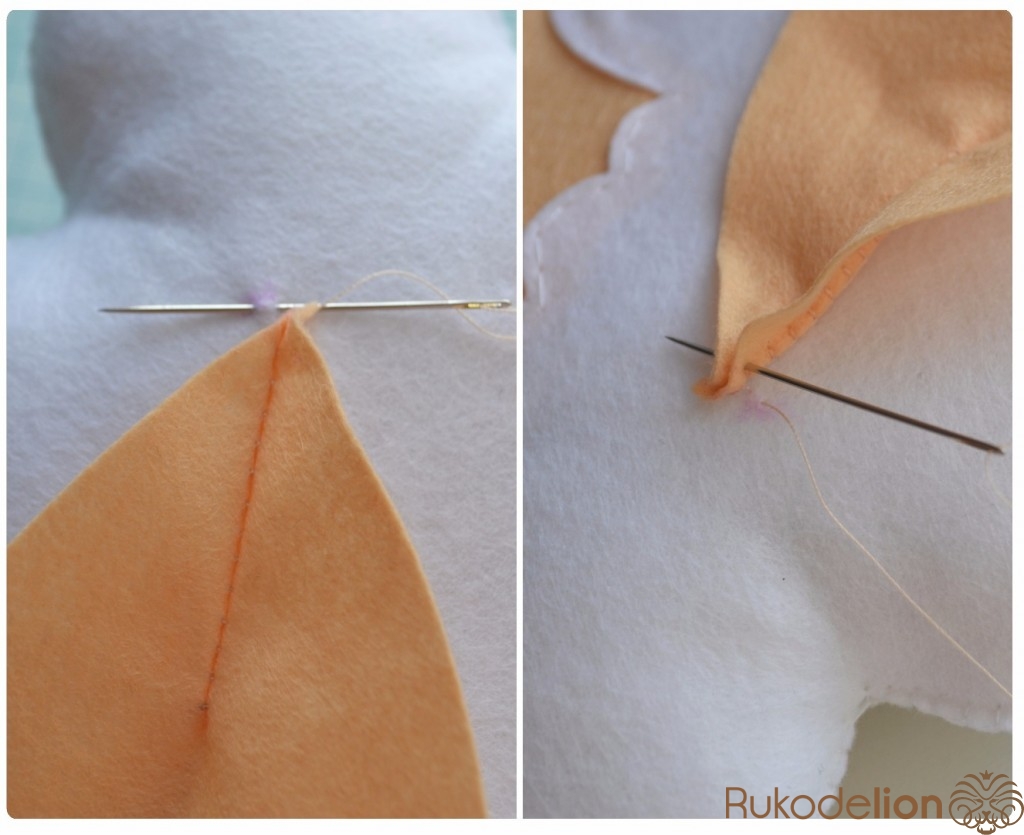 Для пришивания уха удобнее будет, если положить овечку  верх ногами. Пропускаем иголку с ниткой под ухом через белый фетр, затем обратно через бежевый фетр уха (сквозь два слоя). Затем снова обратно проводим иголку под ухом через белый фетр, но уже выводим иголку чуть ниже предыдущего стежка. Опять вводим иголку в ухо. И так постепенно, ведя шов  по спирали, мы опускаемся до середины уха. Заканчиваем шов.  Таким же образом мы пришиваем и второе ухо. Обратите внимание, чтобы ушки были на одном уровне
