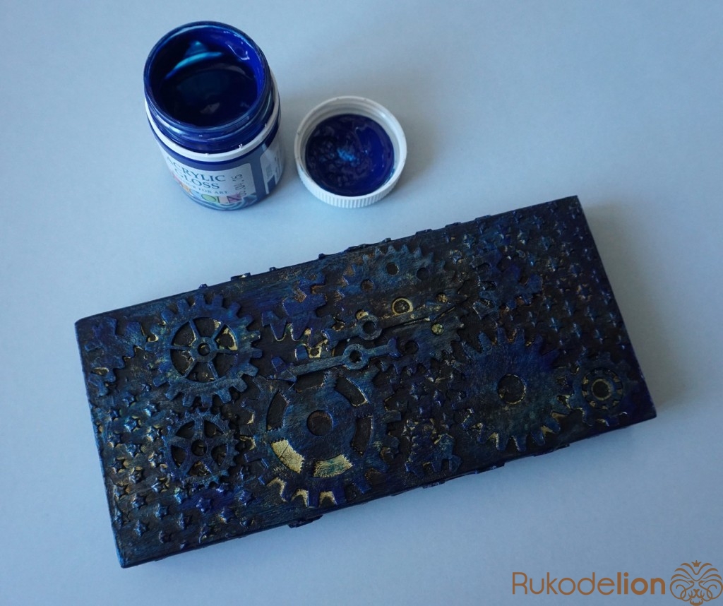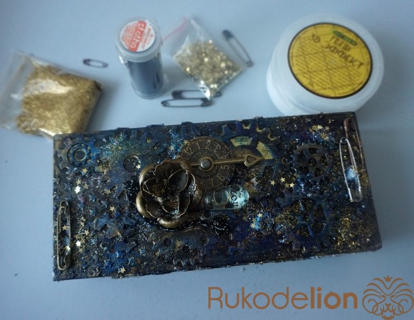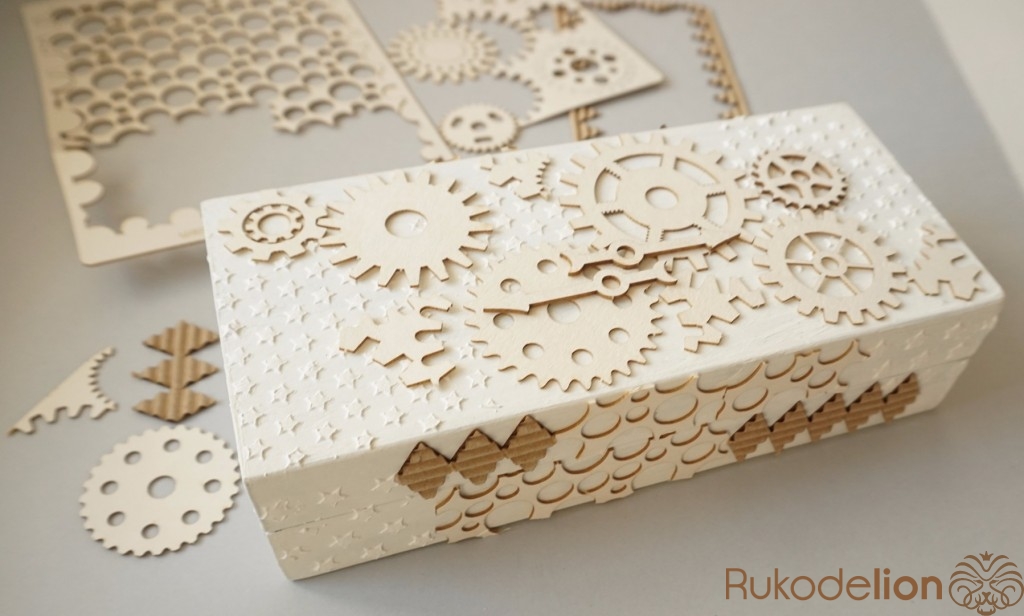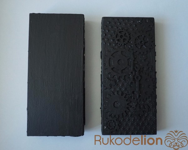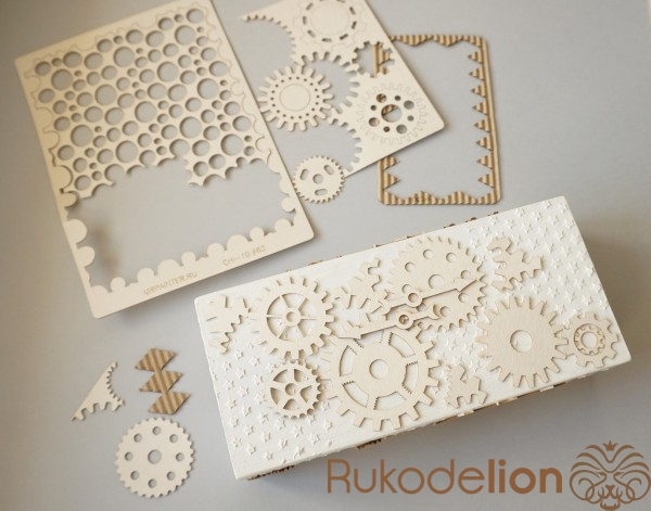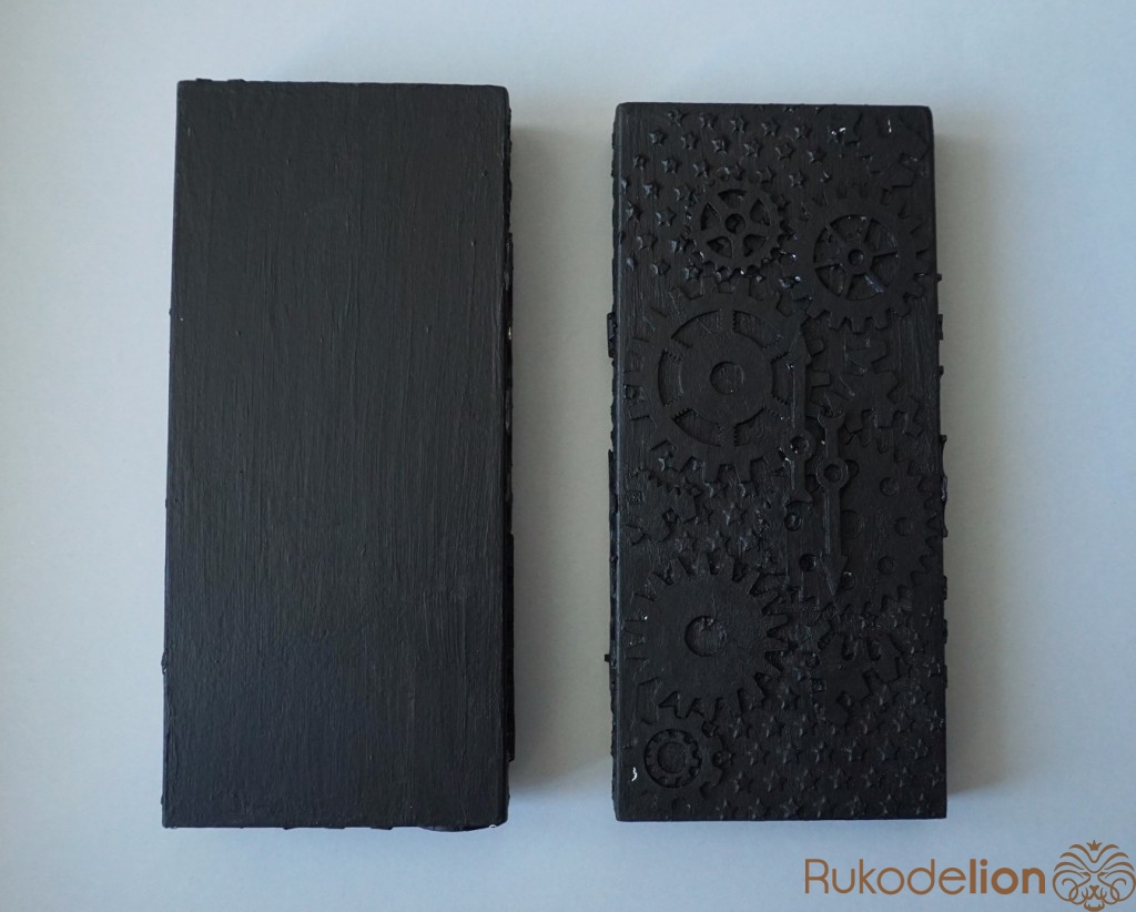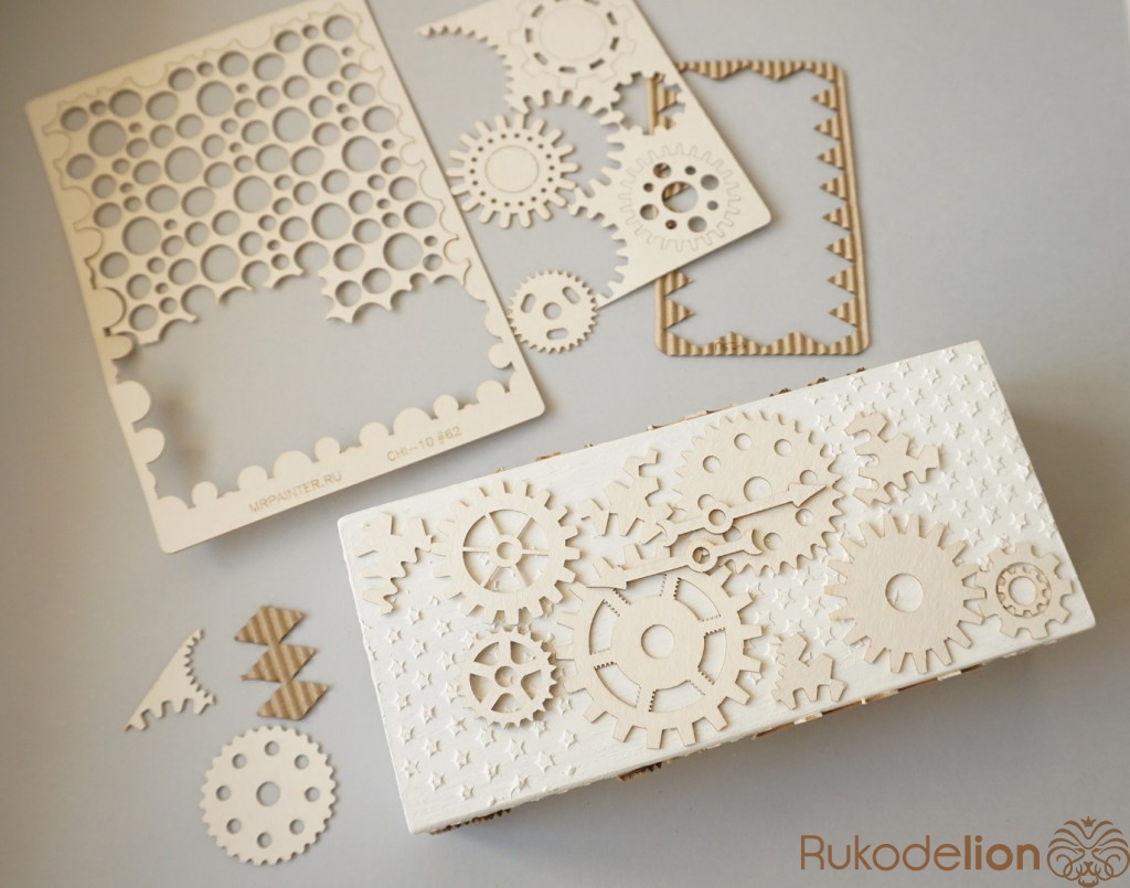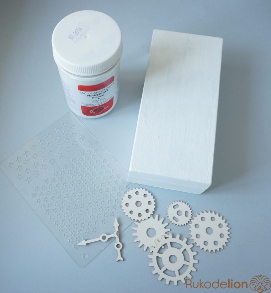 Грунтуем заготовку. Для того, чтобы получить рельефную поверхность нам понадобится текстурная паста и трафареты, чипборд на мужскую тематику (шестеренки, стрелки, звезды и т. д.).