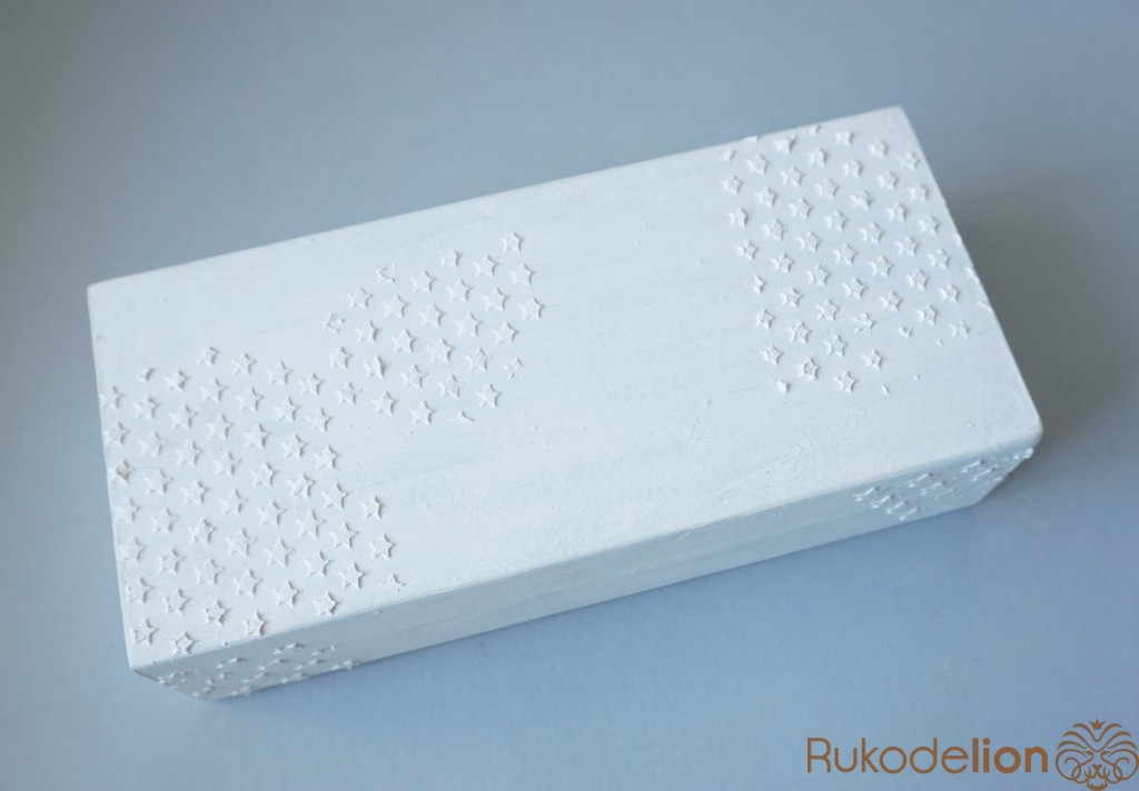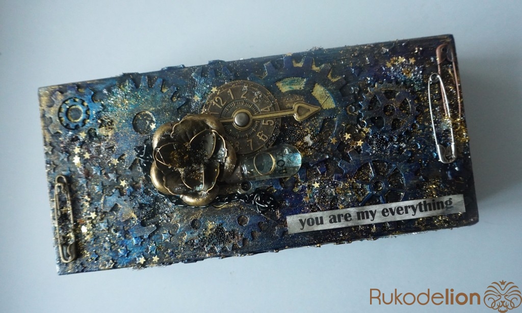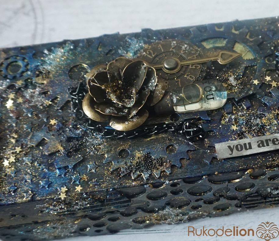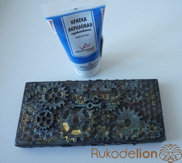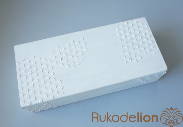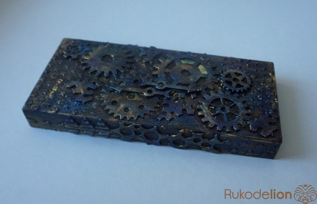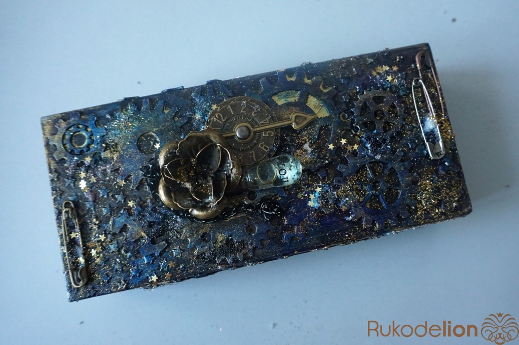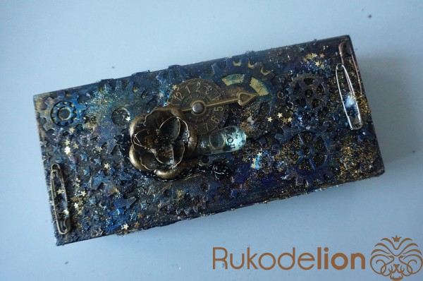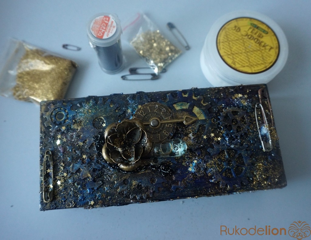 Грунтуем заготовку. Для того, чтобы получить рельефную поверхность нам понадобится текстурная паста и трафареты, чипборд на мужскую тематику (шестеренки, стрелки, звезды и т. д.).