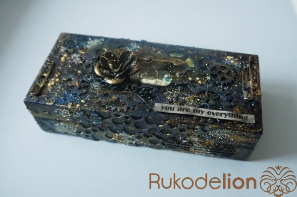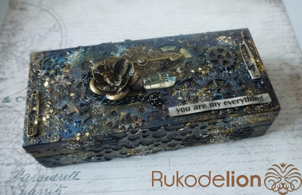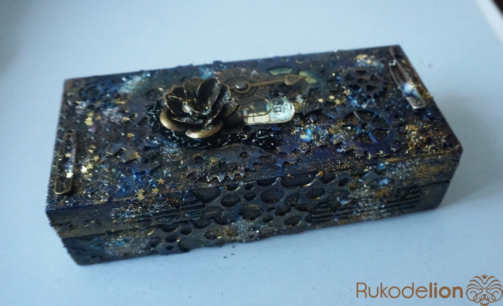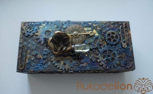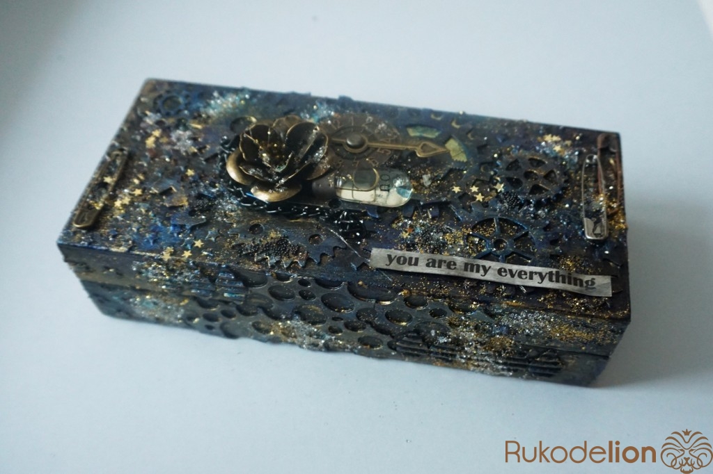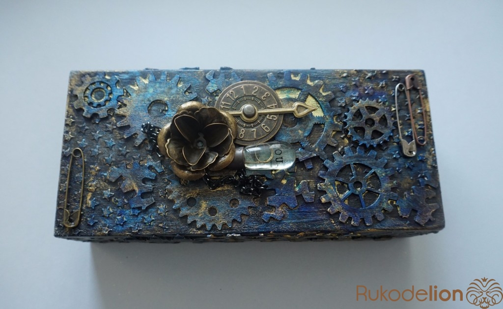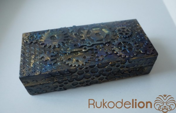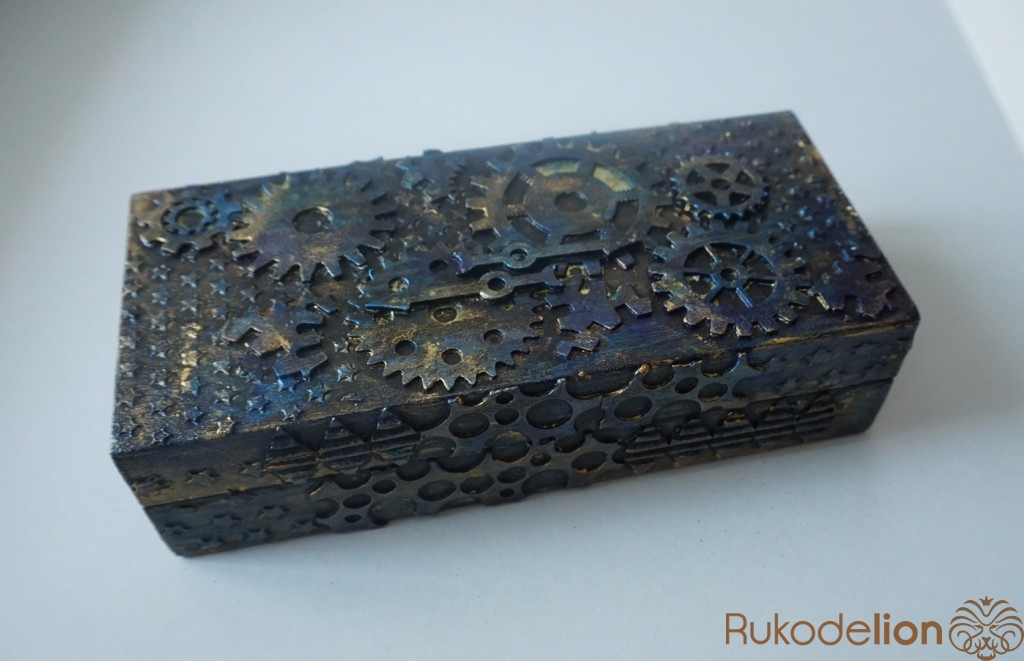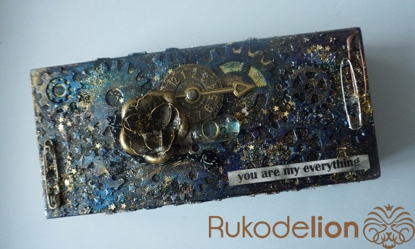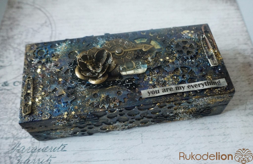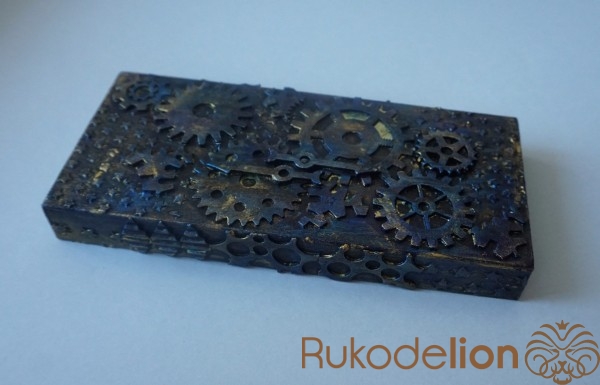 Грунтуем заготовку. Для того, чтобы получить рельефную поверхность нам понадобится текстурная паста и трафареты, чипборд на мужскую тематику (шестеренки, стрелки, звезды и т. д.).