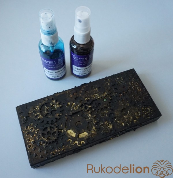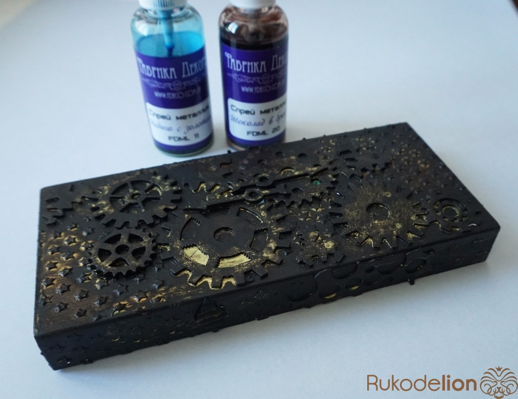 Произвольно наносим на поверхность заготовки спреи-металлики. Они красиво затекают  трещинки и после высыхания, даже если не видно основного цвета спрея, на поверхности остается металлический осадок.