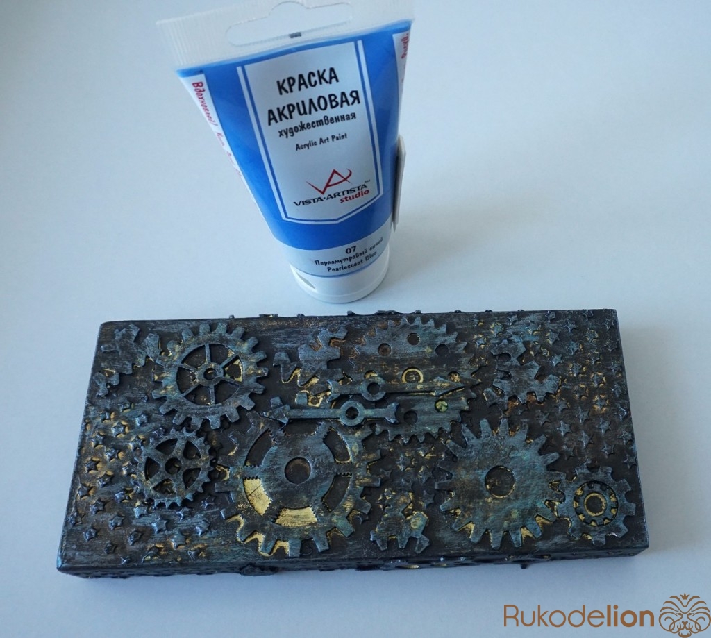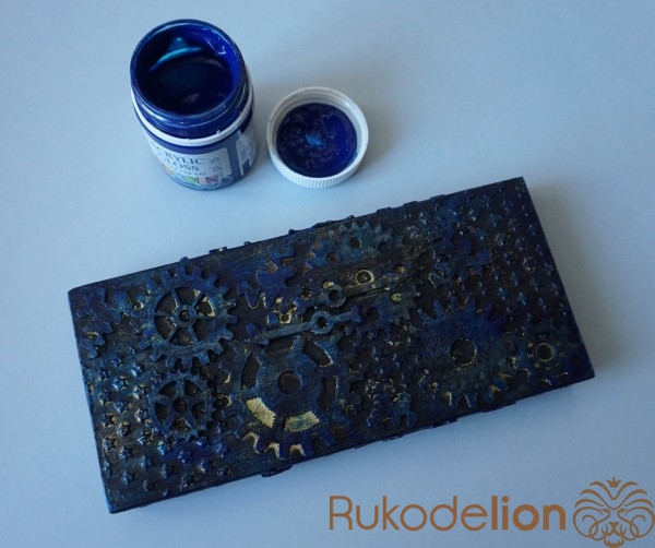 Произвольно сухой кистью или пальцем наносим акриловую краску. Я использовала голубой металлик, темно-синюю и золотую краски. В некоторых местах наносим больше краски, в некоторых меньше.
