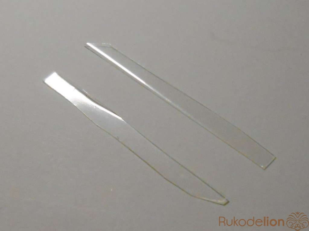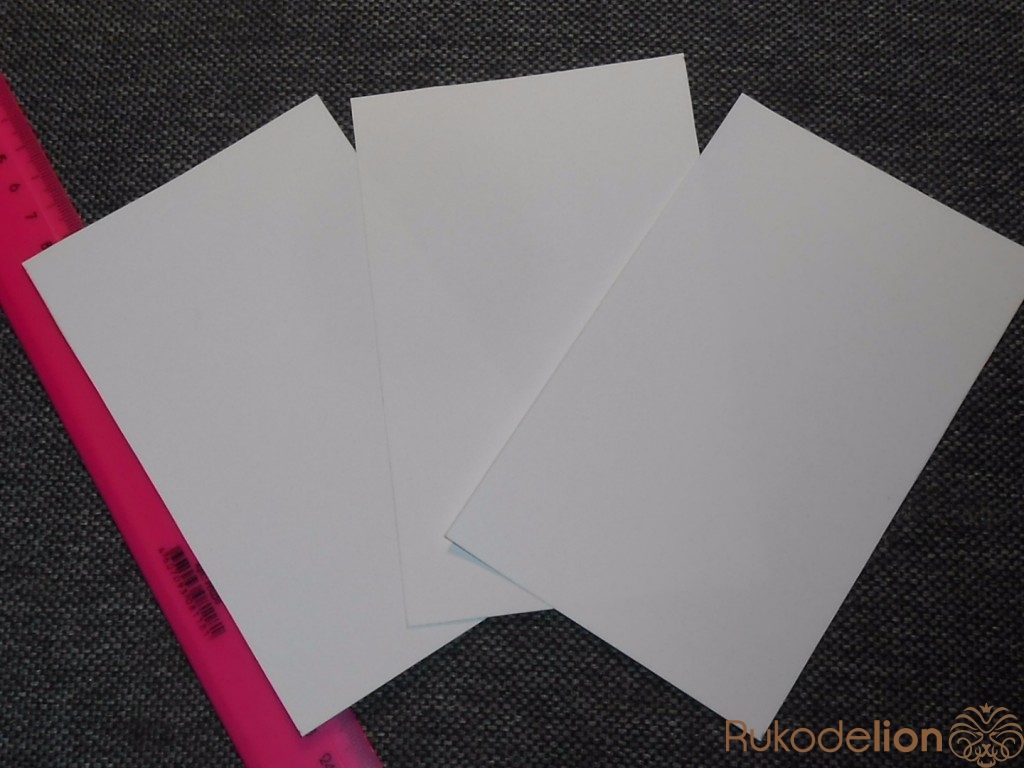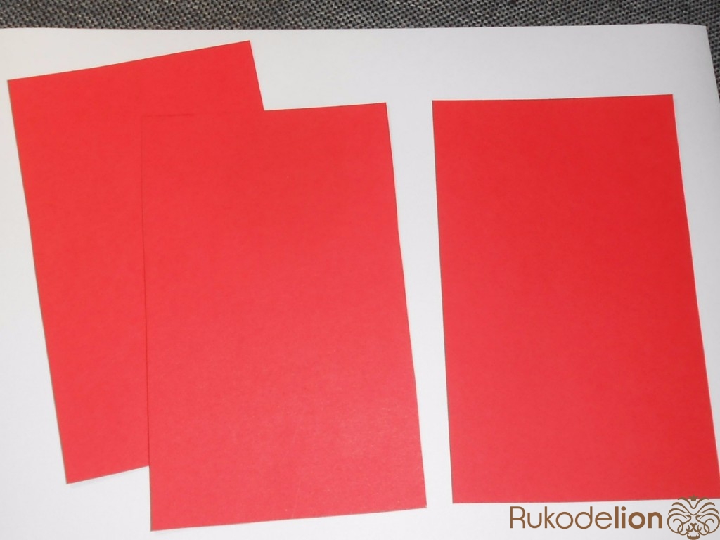 Из красной плотной бумаги вырезаем три прямоугольника размером 9,5x15,5 см. Из белой -три прямоугольника размером 8,5x14,5 см.