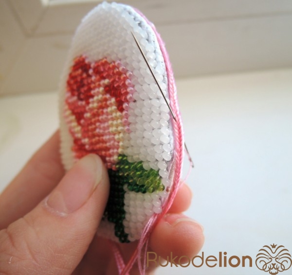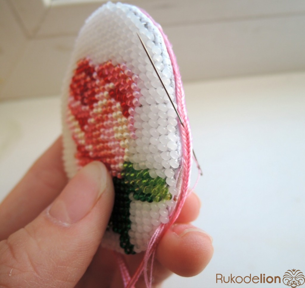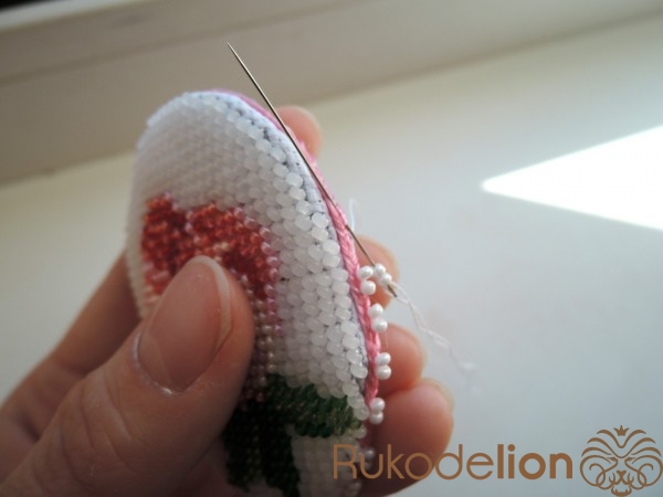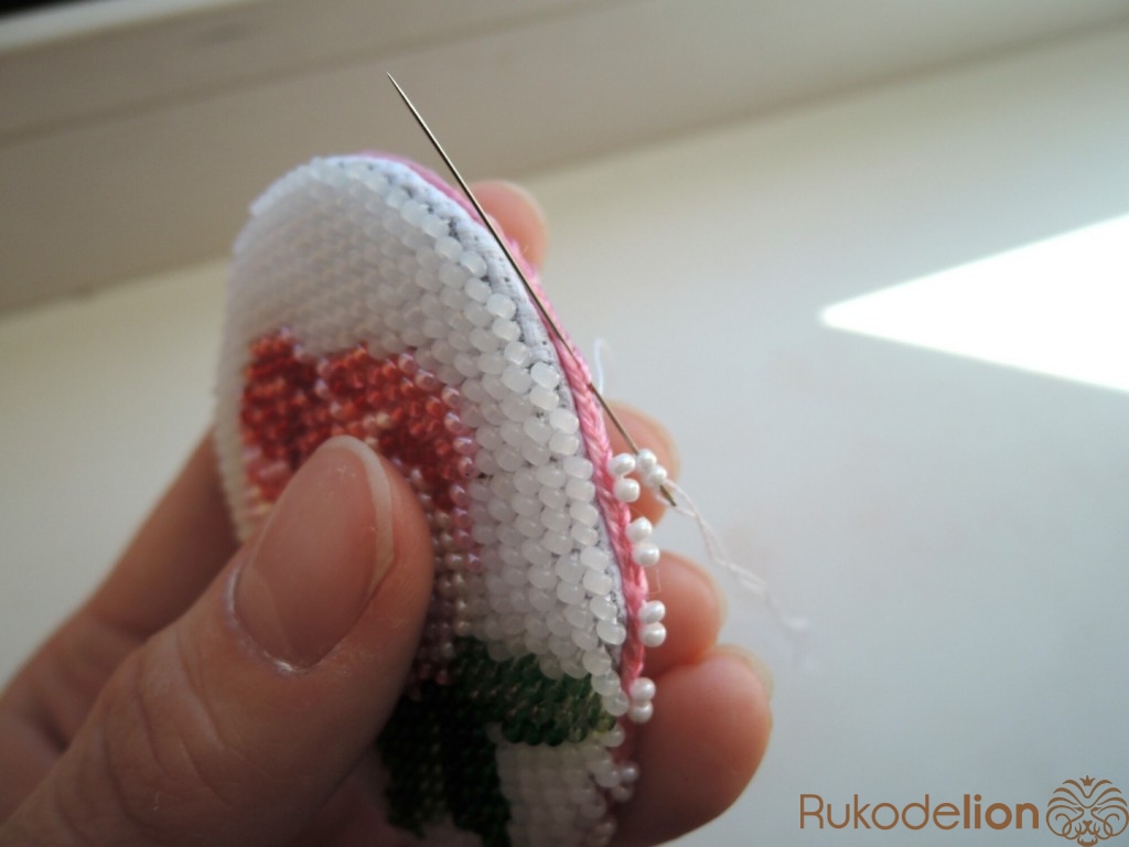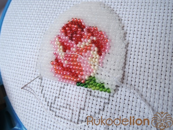 Нить закрепляется двумя стежками на ткани без улов. Бисер пришивается стежком полукрест (направление стежка снизу-вверх; слева направо). По лицевой стороне ложатся по диагонали стежки с бисеринками, а с изнаночной стороны получаются вертикальные стежки. На каждый стежок на лицевой стороне нанизывается одна бисеринка. Вышиваем ряды. Нить закрепляем также несколькими стежками под бисеринкой, без узлов.