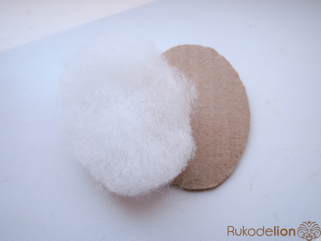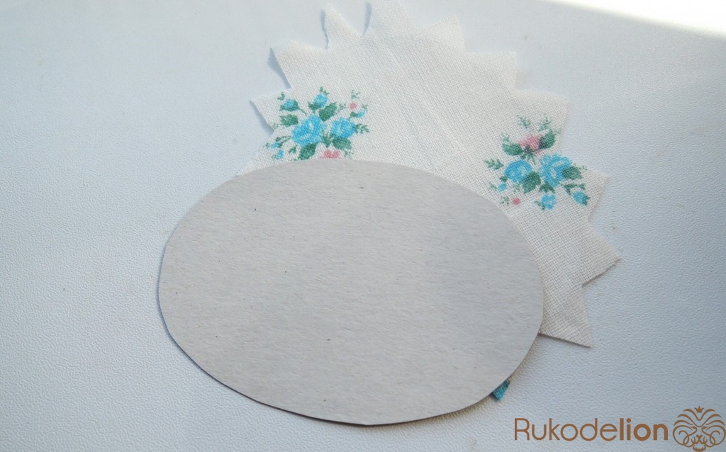 Вырезаем из тонкого картона заготовку такого же размера как брошь. Оборачиваем тканью для оборотной стороны. Со всех сторон закрепить клеем.