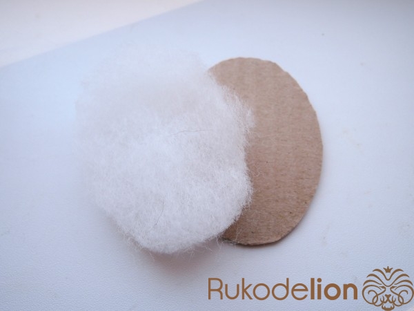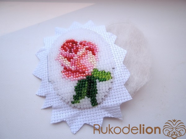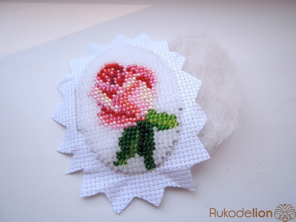 Вырезаем из гофро-картона заготовку для броши. Приклеиваем на нее синтепон. Вышивку из бисера вырезаем с припусками для сборки (0.5-1см). Равномерно натягиваем на картон с синтепоном. С обратной стороны зубчики стягиваем нитками. После, края канвы аккуратно приклеить к картону.