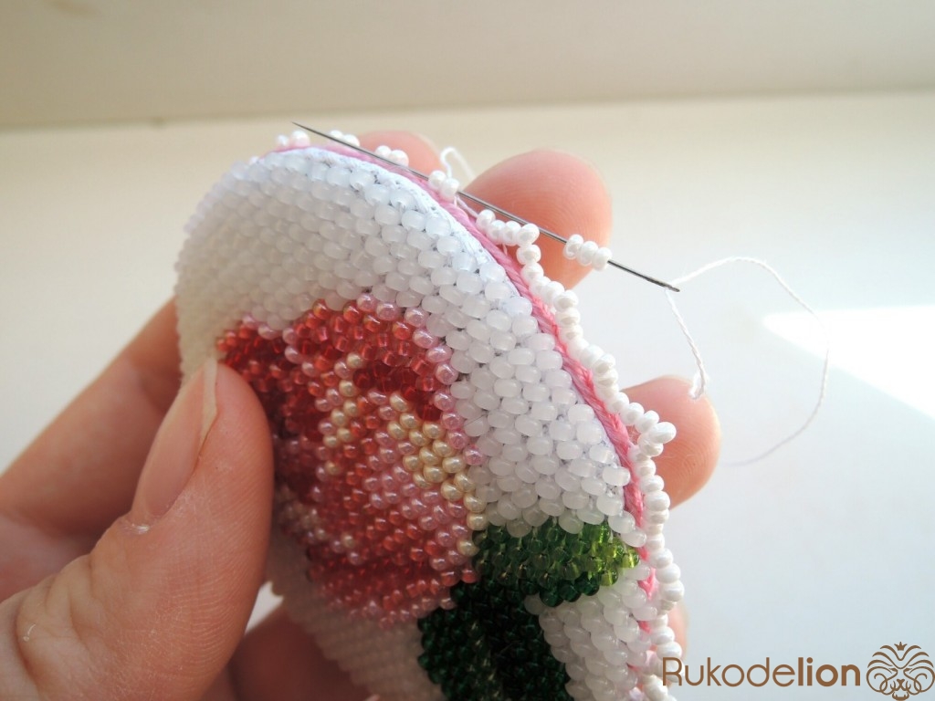 К тесьме пришиваем бисер. В первом круге нанизываем по 2 бисерины в одном стежке. Во втором круге – по 3 бисерины и пропускаем иглу через две уже пришитые к тесьме бисерины.