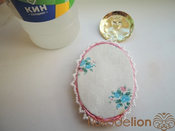 Две детали броши между собой склеиваем и по краю пришиваем тесьму.