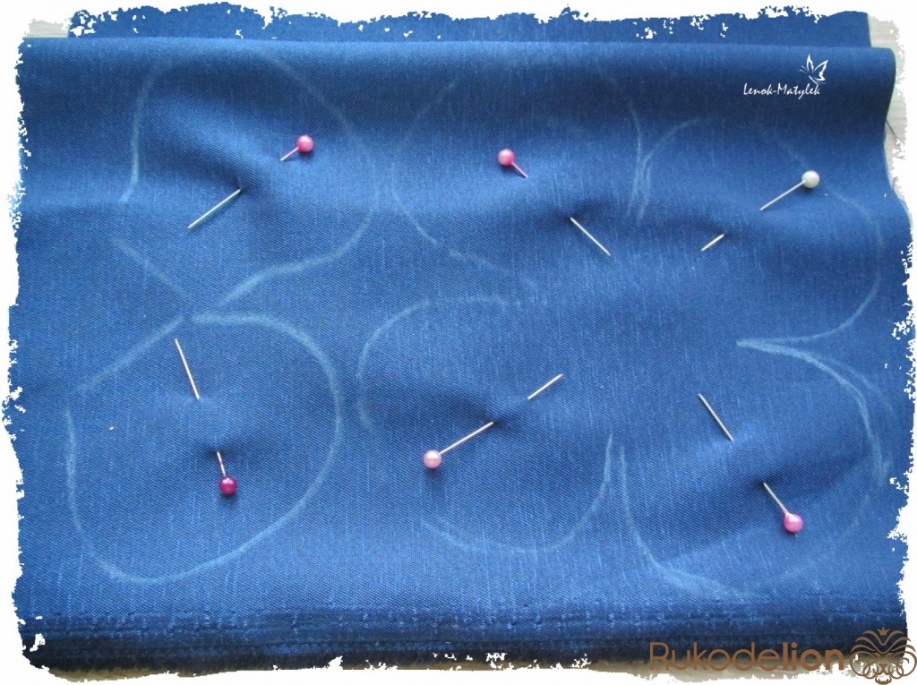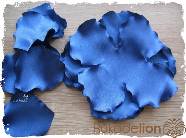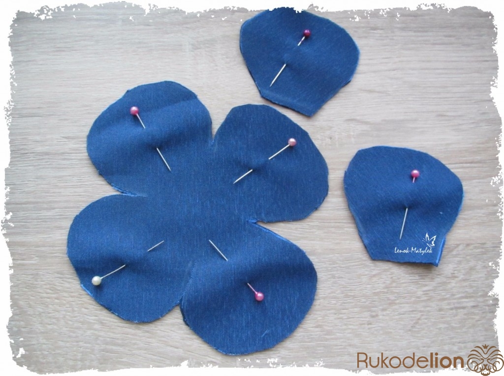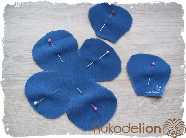 Рисуем на ткани цветочек, для этого лучше использовать заранее вырезанное из плотной бумаги или картона лекало. Затем отдельно рисуем несколько (я делаю 6-8) лепестков. Вырезаем. Для того, чтобы процесс вырезания убыстрить, ткань можно сложить в несколько раз и, предварительно сколов ее булавками, вырезать все детальки одним махом.