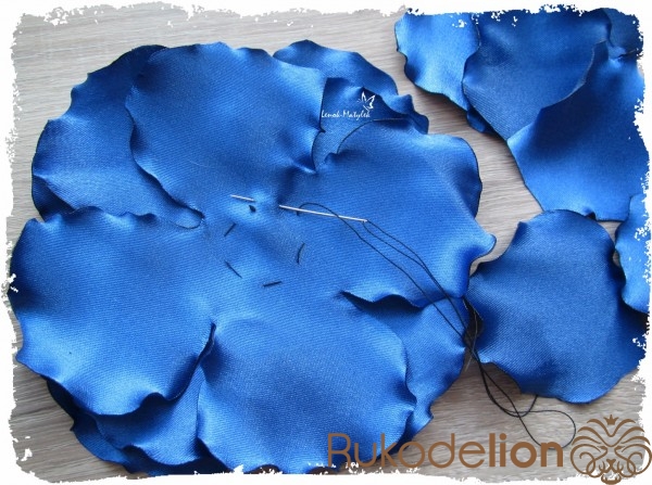 Собираем наш цветочек. Сначала вместе сшиваются детали с четырьмя (в моем случае) лепестками, затем к ним пришиваются отдельные лепестки. Я предпочитаю укладывать детали цветочка не ровно один под один, а с небольшим нахлестом, так, чтобы не было «щелей». Лепесточки перед тем, как пришить предварительно стягиваю, для того, чтобы получились небольшие «складки».