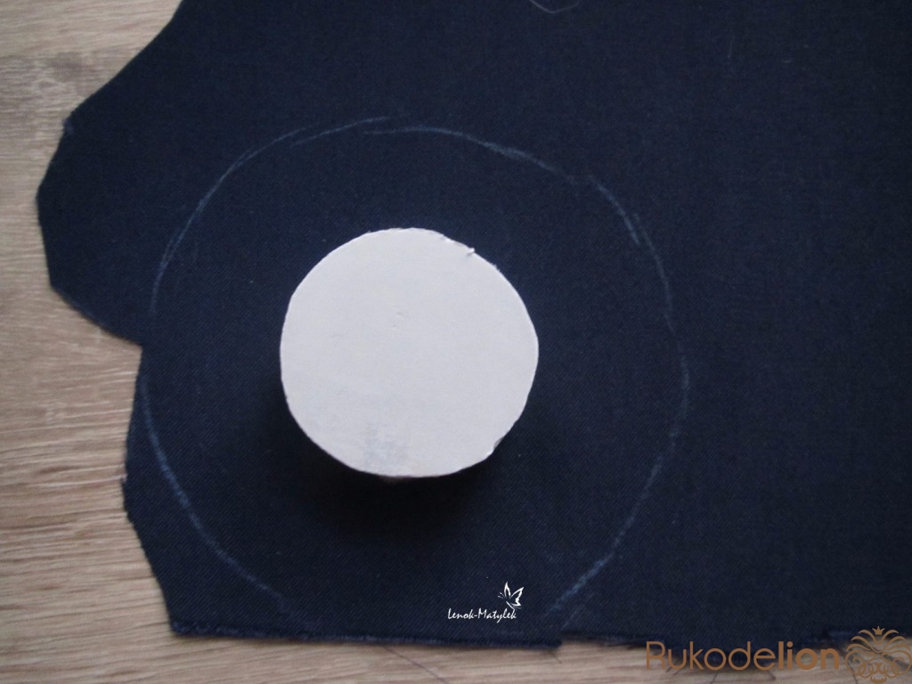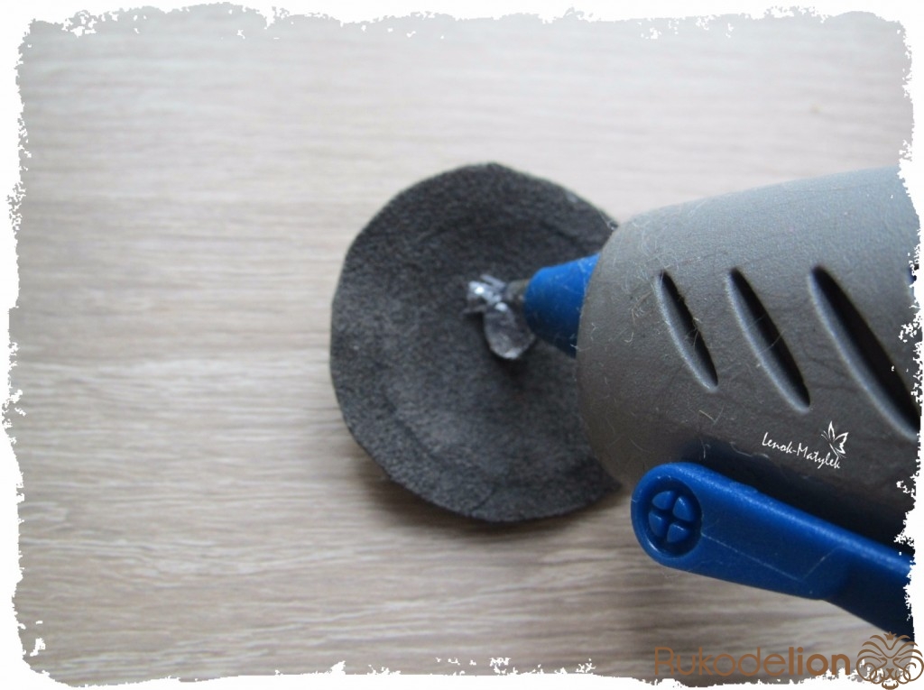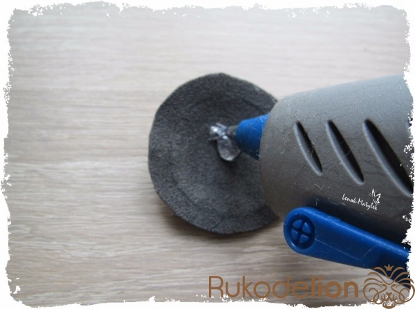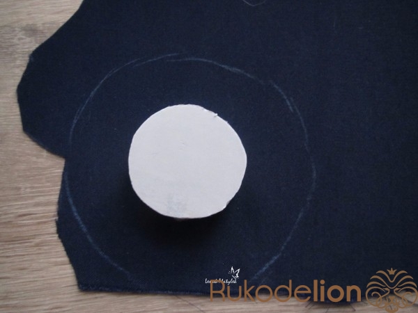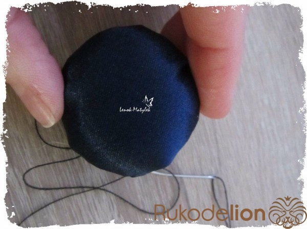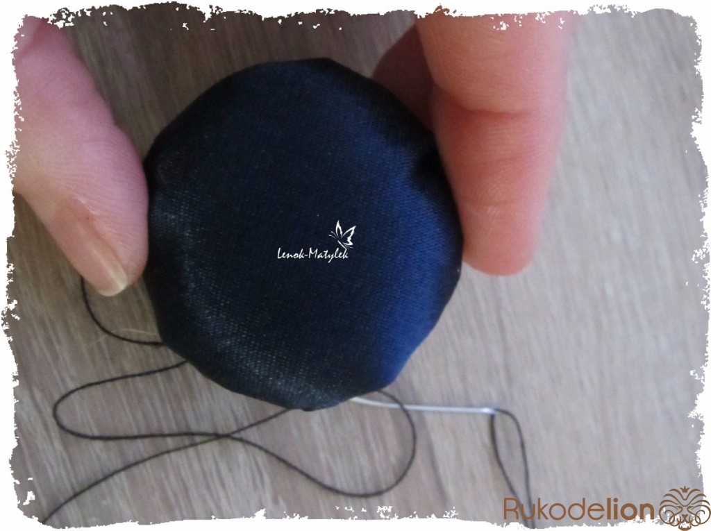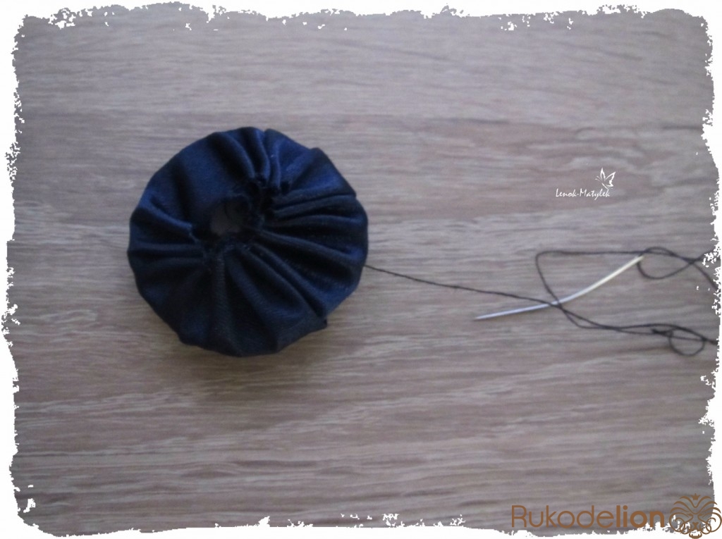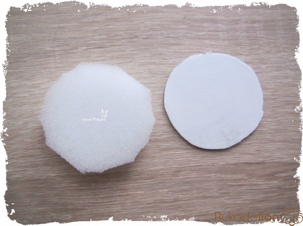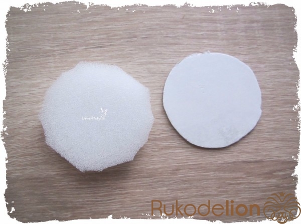 Приступаем к изготовлению сердцевины цветочка. Сначала я также из картона вырезала лекало – круг диаметром около 3 см. Далее по нему из поролона вырезала круг такого же диаметра. Затем из ткани (можно использовать ту же, из которой вырезались лепесточки, но я использовала ткань потемнее) вырезаем еще один круг, но диаметром побольше. Вставляем круг из поролона в середину круга из ткани. Стягиваем ткань таким образом, как показано на рисунке.