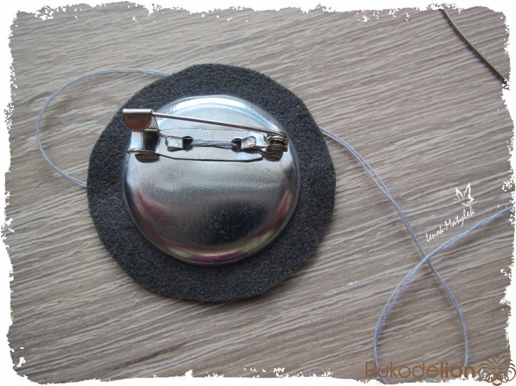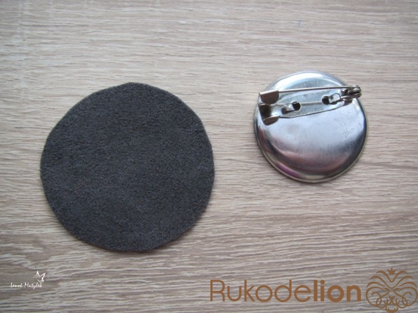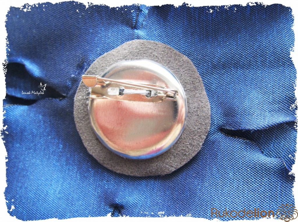 Осталось прикрепить крепление для броши. Для этого лучше использовать готовое, нежели обычную булавку. Я для надежности крепление пришиваю, а потом еще и проклеиваю.