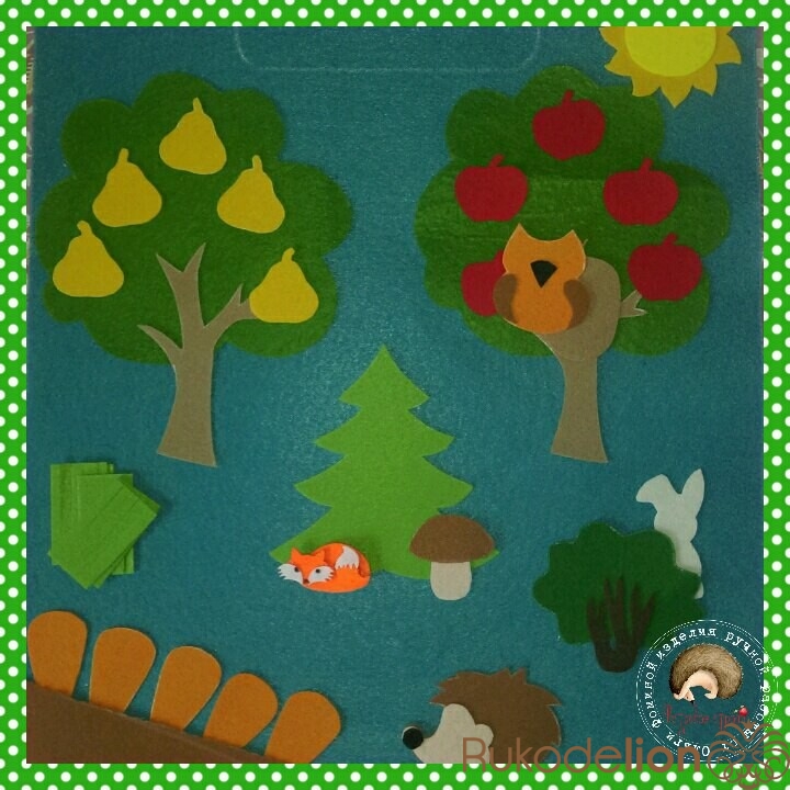 Бирюзовый фетр жесткий, темно-зеленый мягкий, салатовый, коричневый, светло-коричневый, оранжевый, желтый, черный, белый, красный.