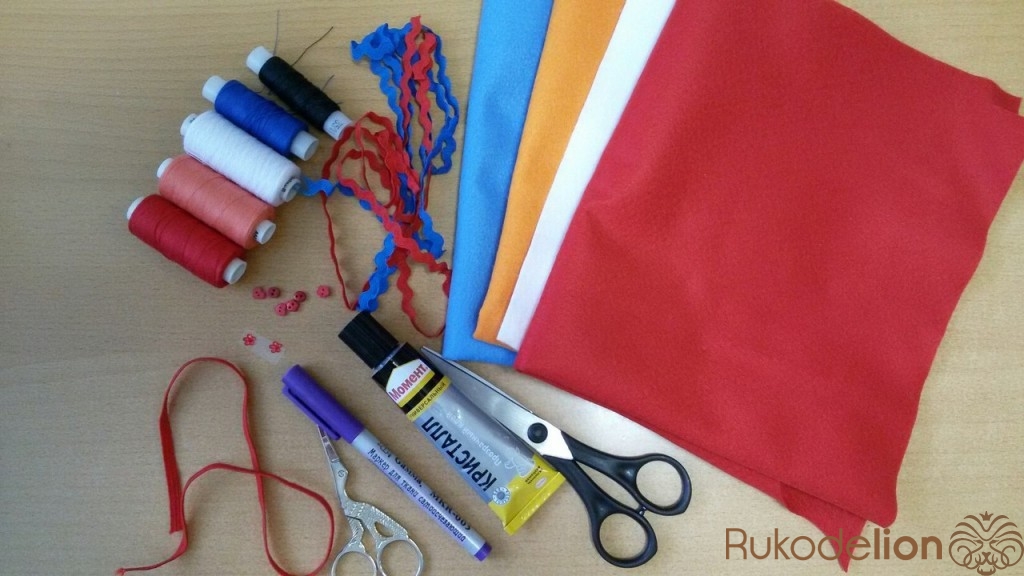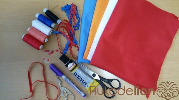 Берем деталь пузика и украшаем его. Я использовала для украшения тесьму «вьюнчик», красного и синего цвета, приклеила ее к детальке клеем «Момент Кристалл».