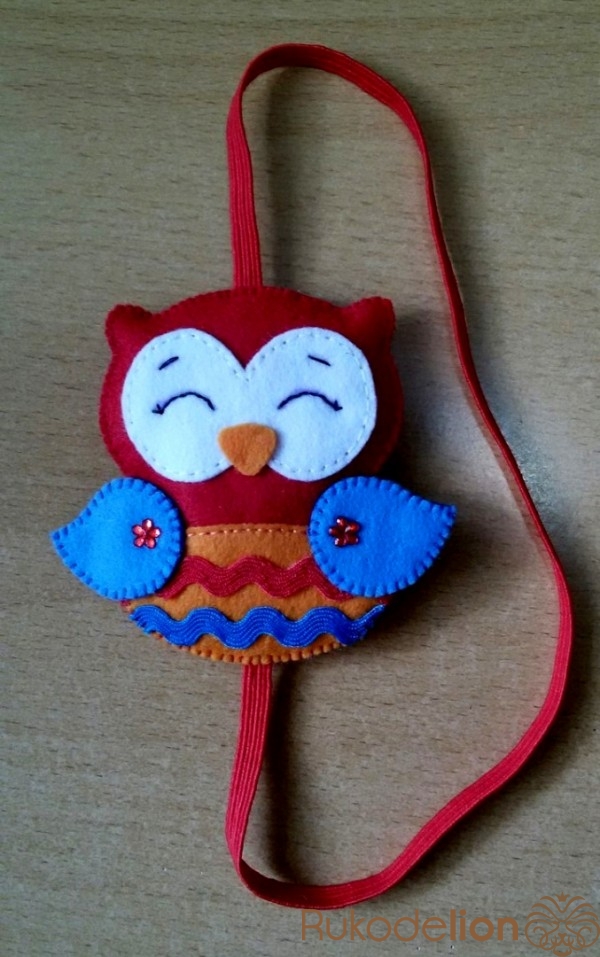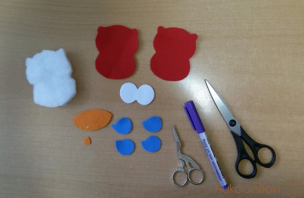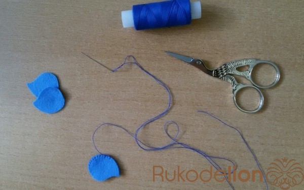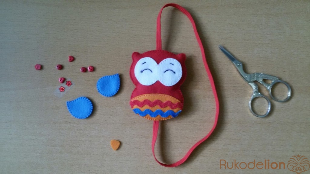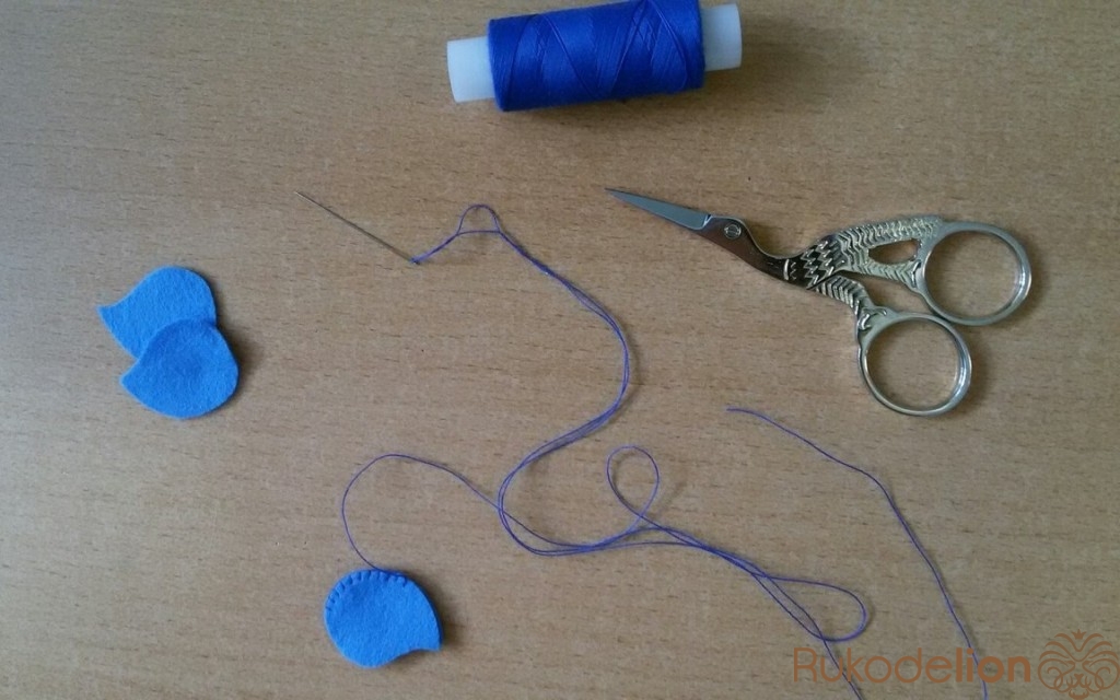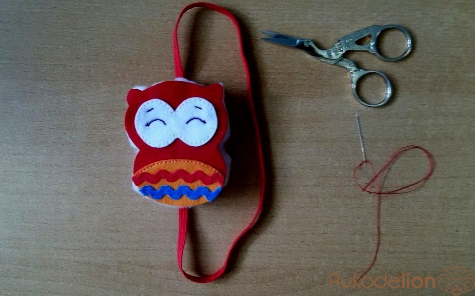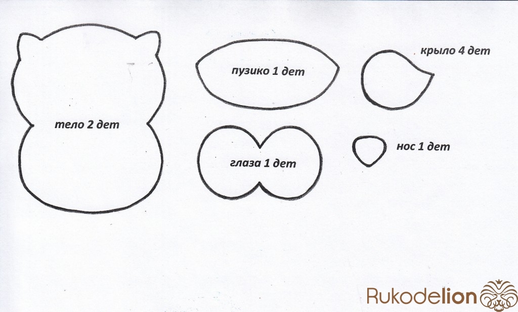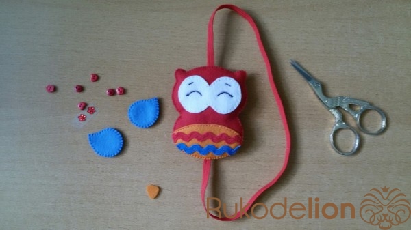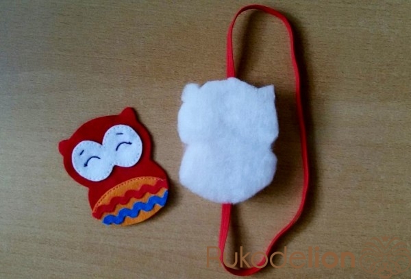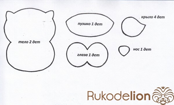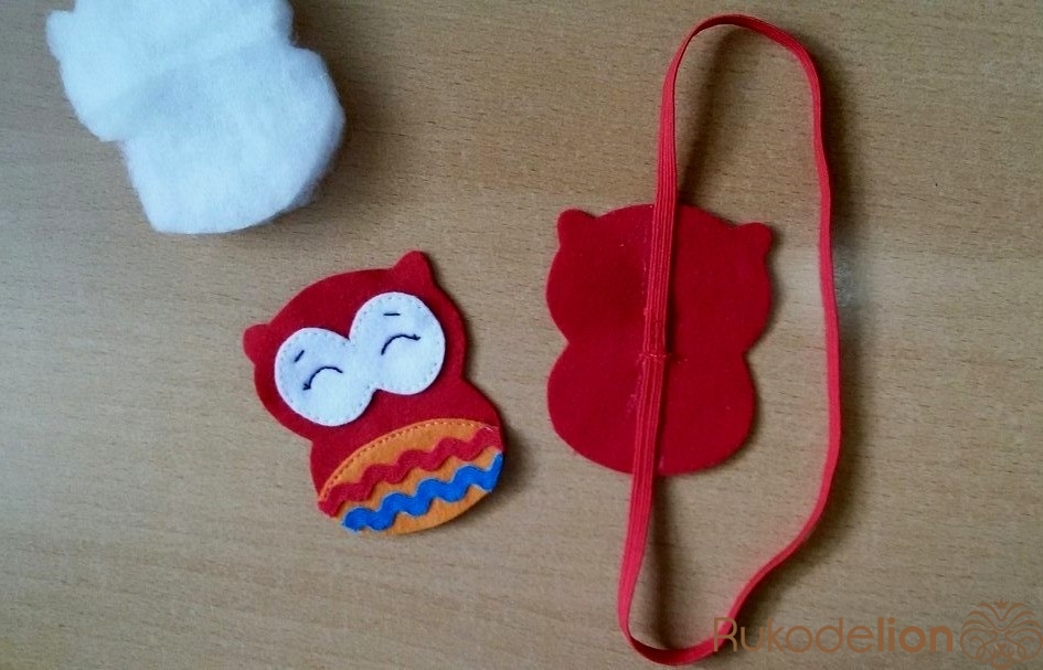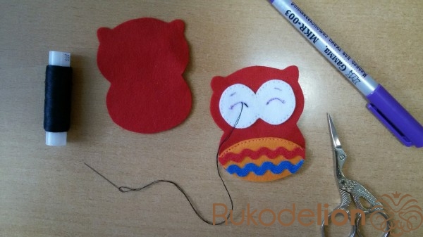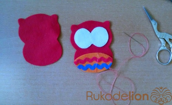 К одной детали тела совушки, прикладываем деталь глаз и пузико, закрепляем их клеем «Момент Кристалл», для удобства пришивания и пришиваем швом «назад иголка»
