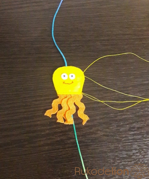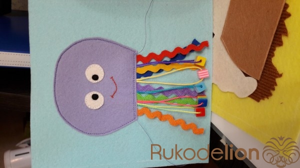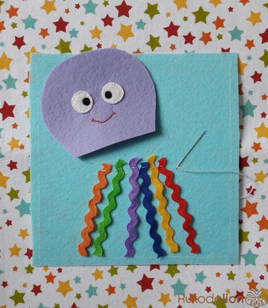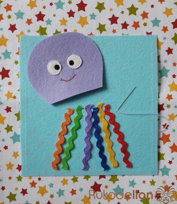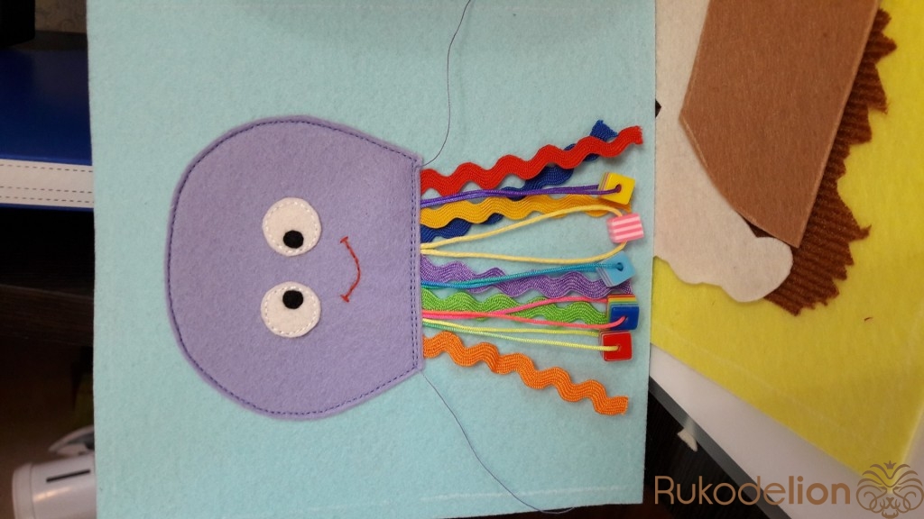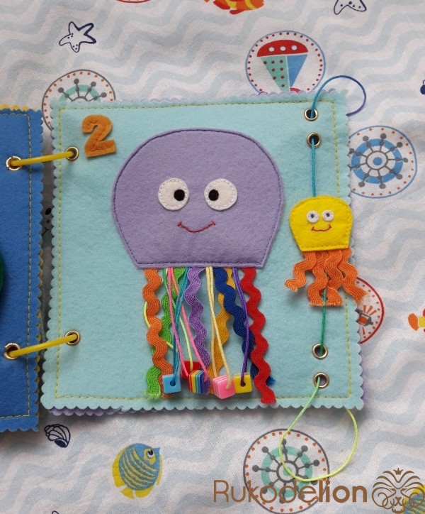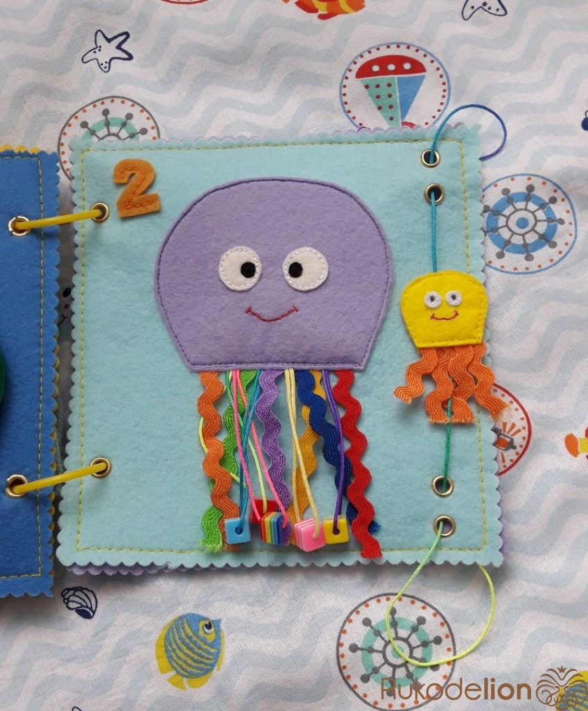 Для щупалец медузы нарезаем  ленту зигзаг и вощеный шнур с бусинками. Согласно выкройке вырезаем тело медузы и вышиваем глаза и ротик. На основе страницы отмечаем полосу, к которой мы пришьем щупальцы. Сверху пришиваем тело медузы.  Шьем маленькую медузу перетяжку. Вырезаем тело медузы и вышиваем лицо. Берем кусочек фетра,кладем сверху  вощеный шнур и  тело  медузы,прошиваем. На странице устанавливаем люверсы, вставляем перетяжку.  Пришиваем цифру 2.