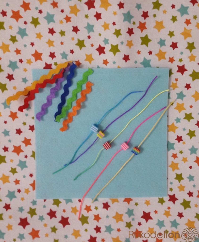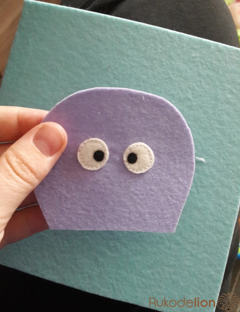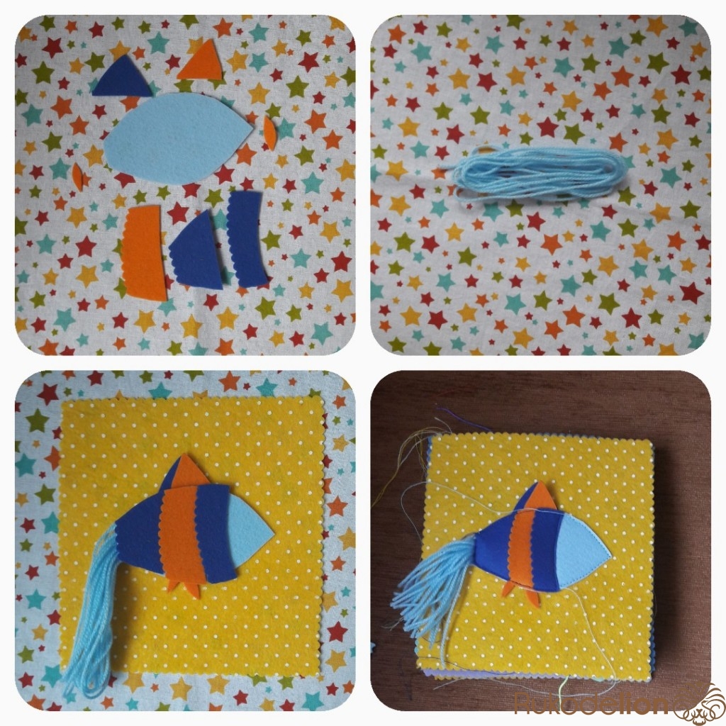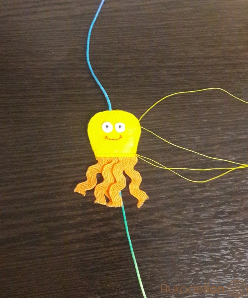 Для щупалец медузы нарезаем  ленту зигзаг и вощеный шнур с бусинками. Согласно выкройке вырезаем тело медузы и вышиваем глаза и ротик. На основе страницы отмечаем полосу, к которой мы пришьем щупальцы. Сверху пришиваем тело медузы.  Шьем маленькую медузу перетяжку. Вырезаем тело медузы и вышиваем лицо. Берем кусочек фетра,кладем сверху  вощеный шнур и  тело  медузы,прошиваем. На странице устанавливаем люверсы, вставляем перетяжку.  Пришиваем цифру 2.