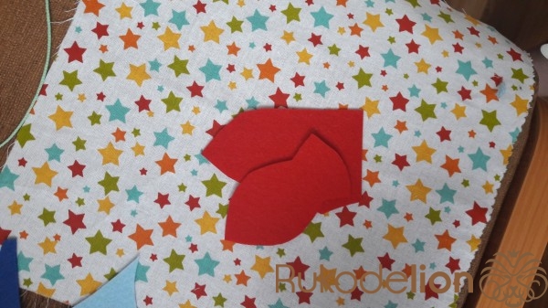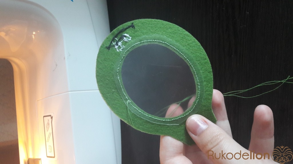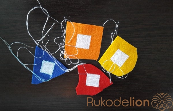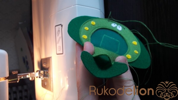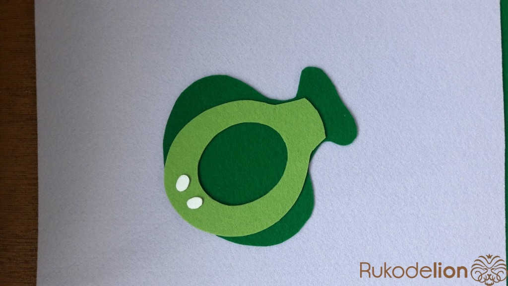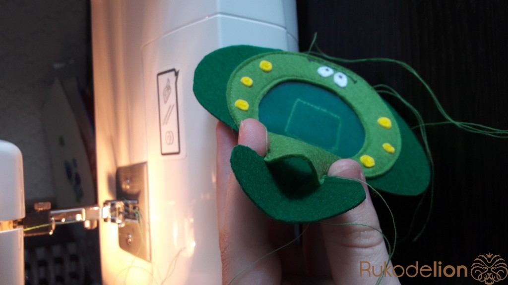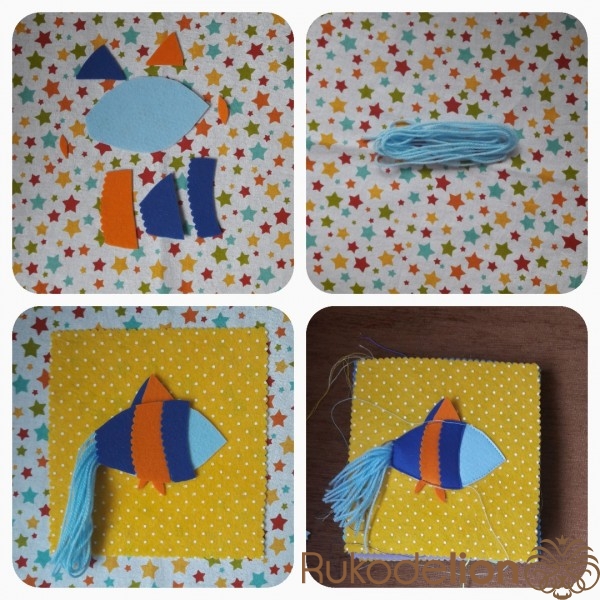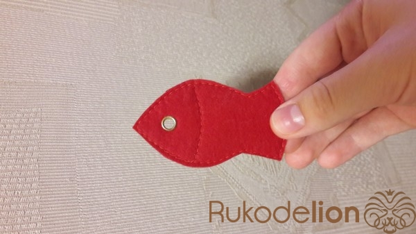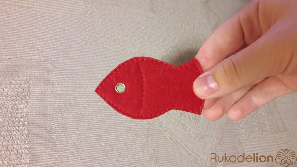 Шьем рыб.Вырезаем по выкройке рыб.К кусочку фетра пришиваем рыбу по контуру и прошиваем голову, на место глаза устанавливаем люверс.