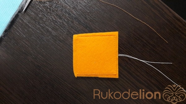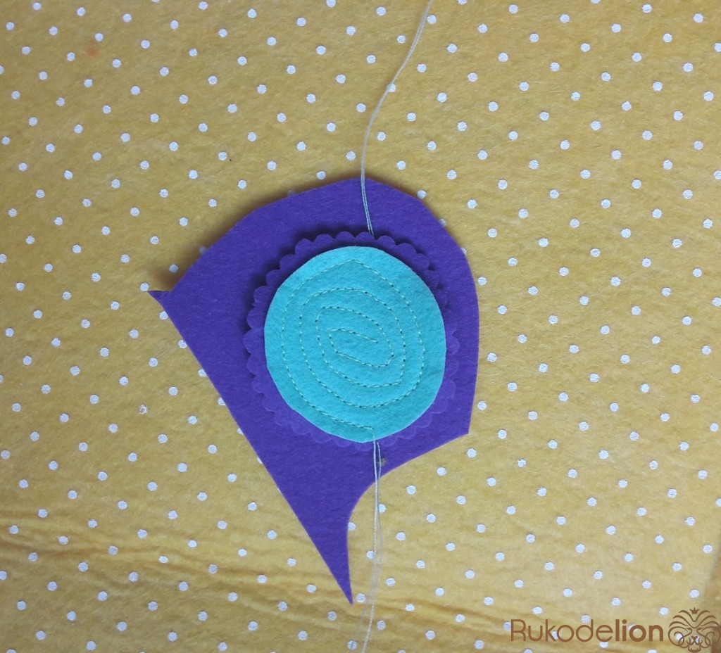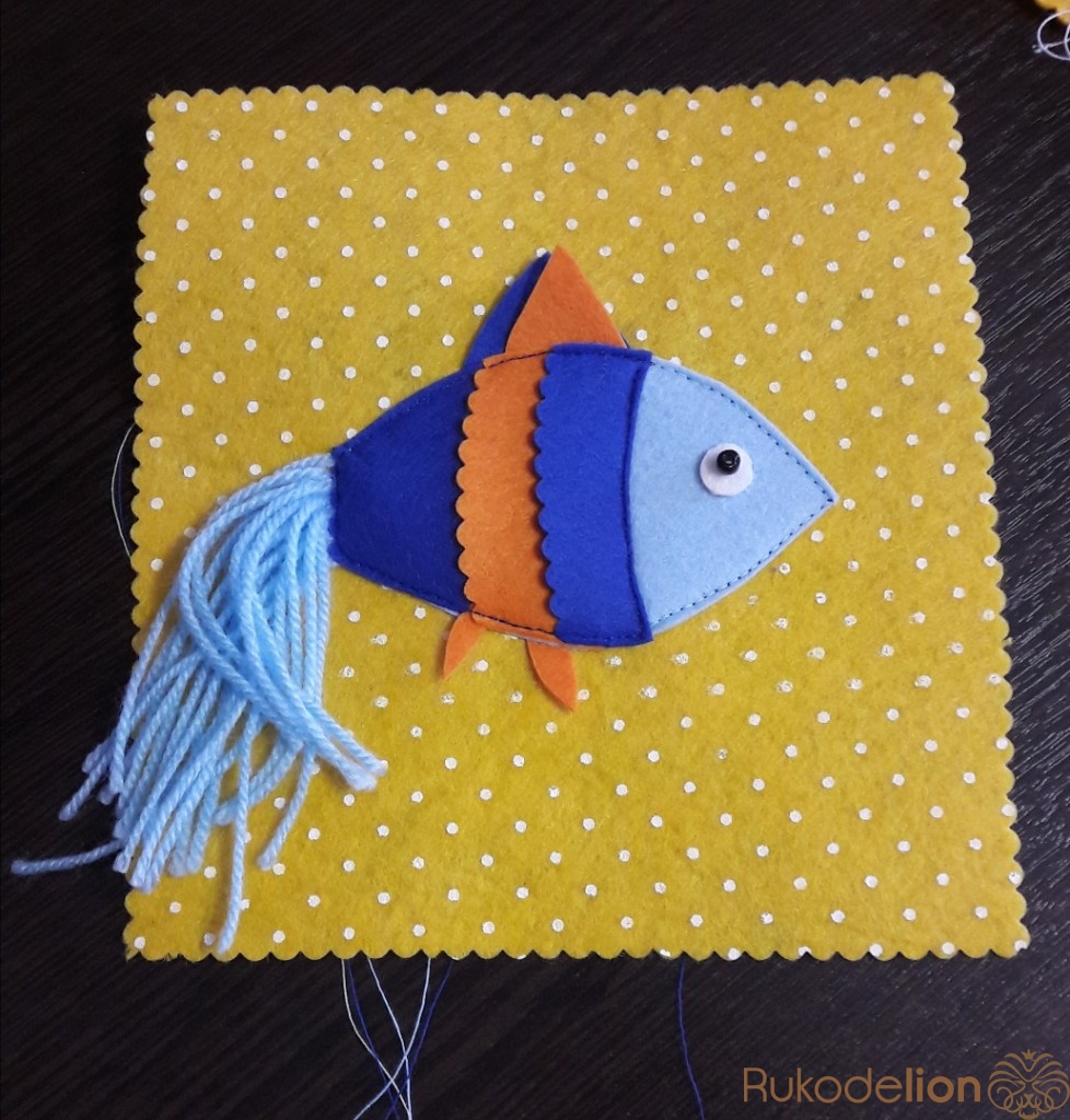 Вырезаем  детали согласно выкройке,ножницами зигзаг вырезаем чешую рыбы, прикладываем их к нашей основе.Берем пряжу и отмеряем хвост,подкладываем его под фетр. Пришиваем сначала синими нитками одну часть и вторую голубыми. Берем белый круг из фетра и на него пришиваем бусинку,глаз готов.