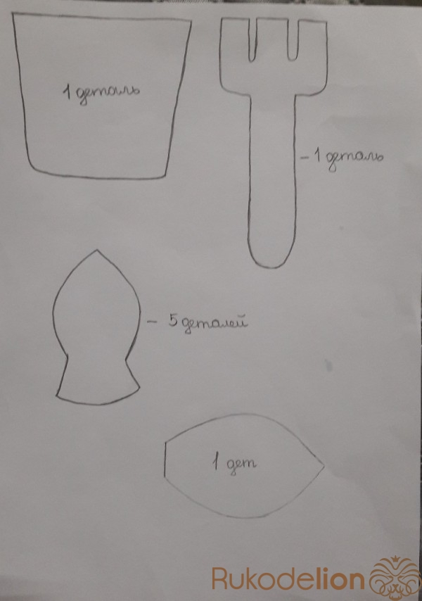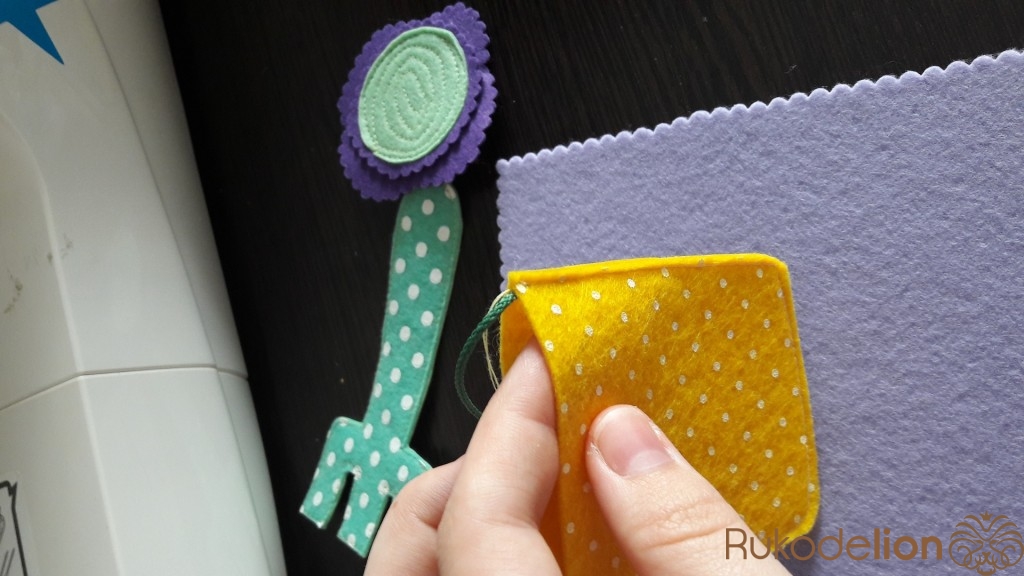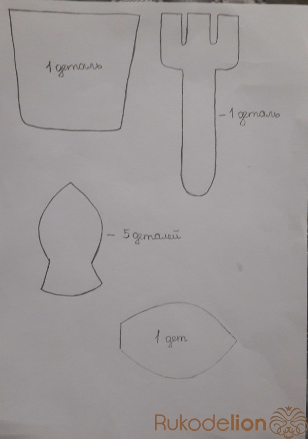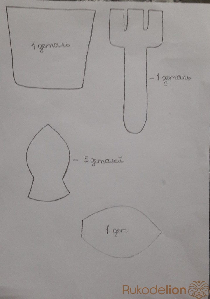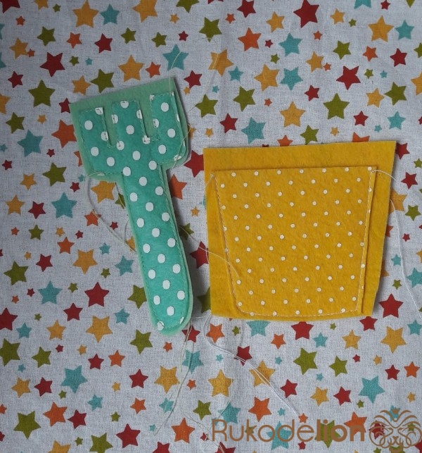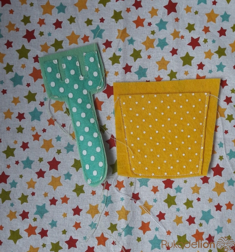 Вырезаем детали согласно выкройке.Грабли и лопатку прошиваем по контуру,подложив фетр.Обрезаем лишнее.К ведерку пришиваем вощеный шнур.Шьем формочку,прошиваем овал по кругу до середины,подкладываем еще фетр и прошиваем по кругу. К основе пришиваем цифру 3 и крючок.